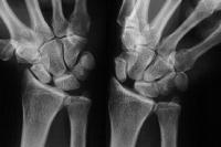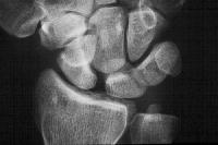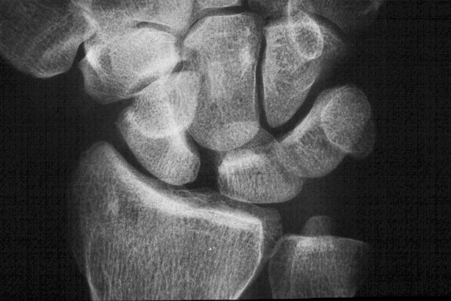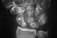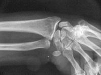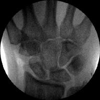 | Scapholunate dissociation: The scaphoid palmar flexes and translates away from the lunate-triquetrum complex, which dorsiflexes. |