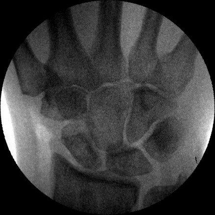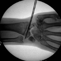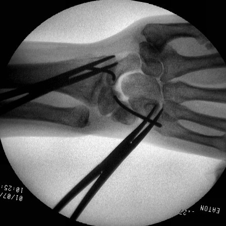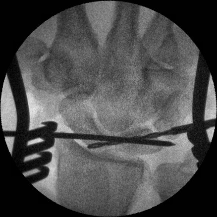 | Intraoperative correction of scapholunate rotation using K-wires as joysticks on each bone. |