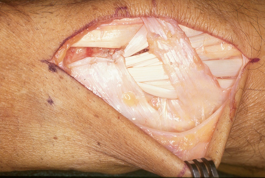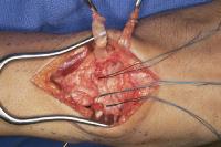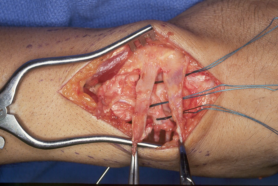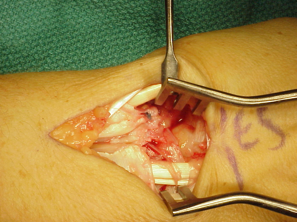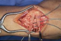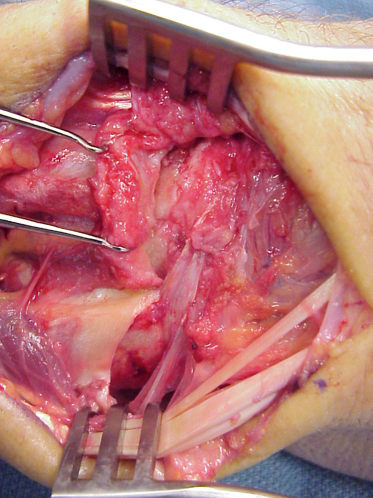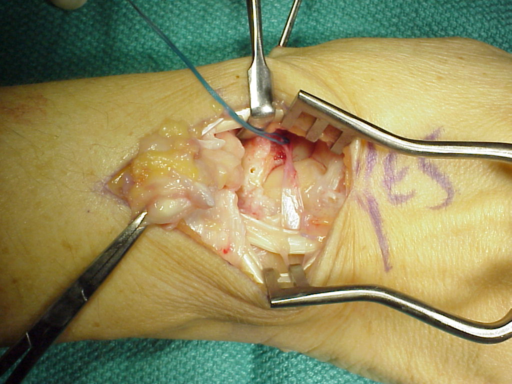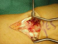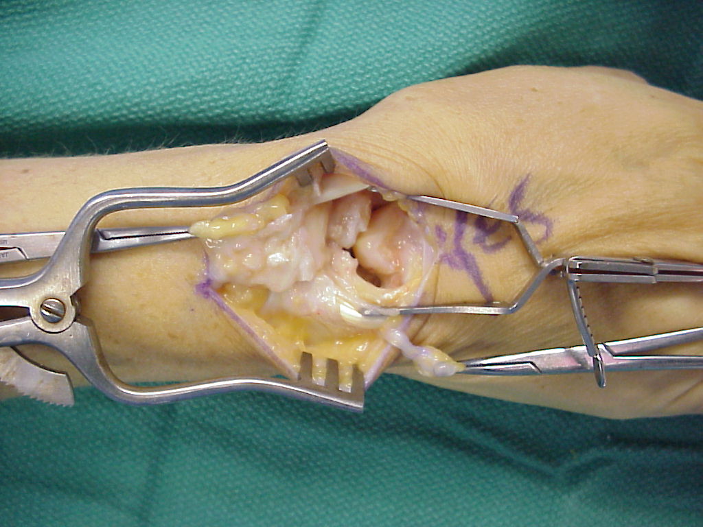 | Case 2. Direct repair of scapholunate ligament and retinaculum transfer (Ragnell retractor beneath). (Right hand, fingers to the right) |