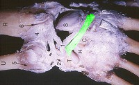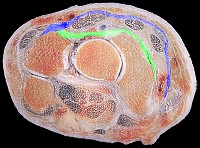 | Normal relationship of the dorsal intercarpal ligaments (green) and extensor retinaculum (blue) at the level of the triquetrum. (image modified from Zancolli E A, Cozzi E P 1992 Atlas of Surgical Anatomy of the Hand. Churchill Livingstone, Edinburgh.) |