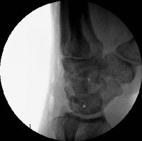 | Scapholunate pins and bone anchors - intraoperative fluoroscopy. |
