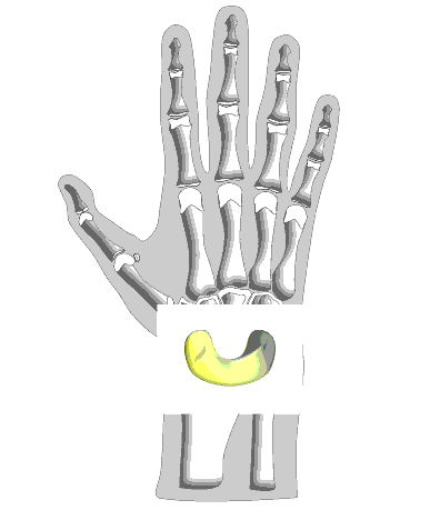 | The scaphoid, lunate and triquetrum form a somewhat flexible unit having the shape of the arc of a spiral and interesting biomechanics. For example, when the wrist moves from radial to ulnar deviation, the proximal carpal bones move in a perpendicular direction, rotating from palmar to dorsal flexion. Here, the three proximal carpal bones are illustrated as one unit: |