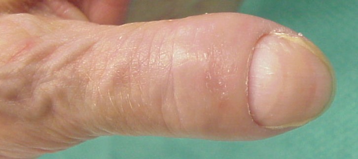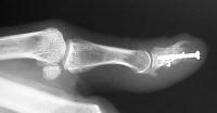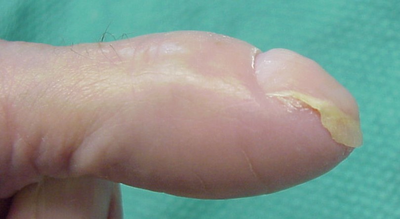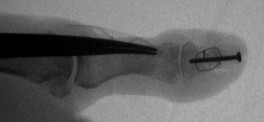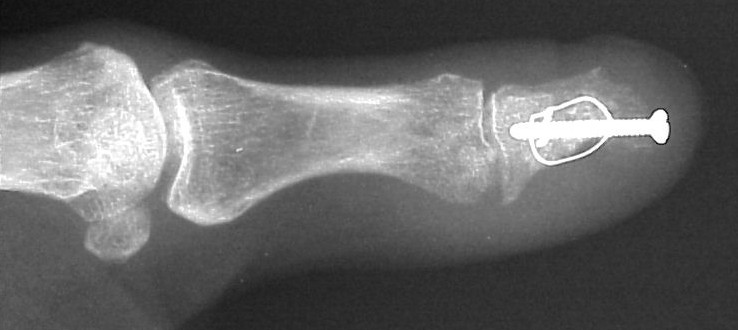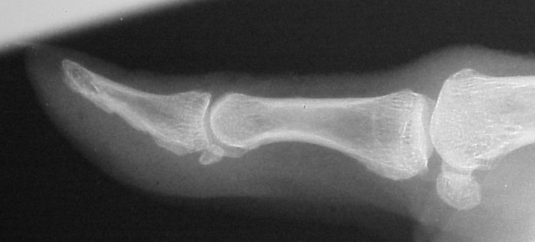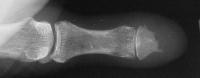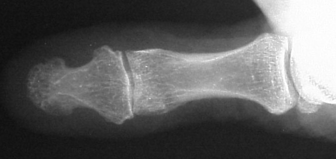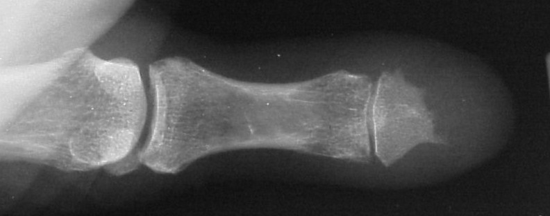 | Plain films showed resorption of the distal two thirds of the distal phalanx: |