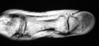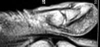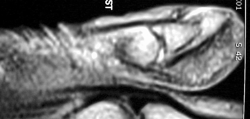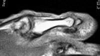 | MRI demonstrated ill defined soft tissue replacement of the majority of the distal phalanx: |