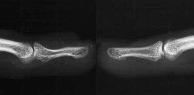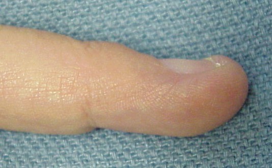 | Plain films confirmed a concave contour deformity of the dorsal aspect of the distal phalanx, shown here compared to the opposite, normal finger film: |