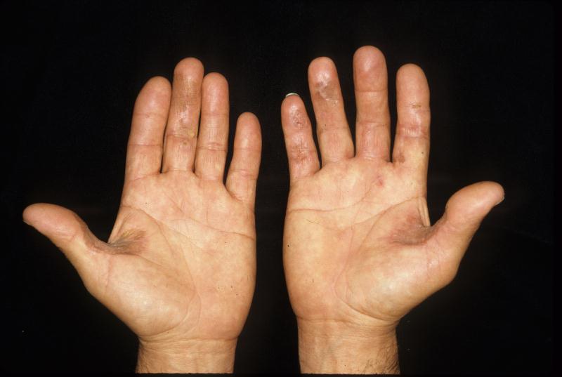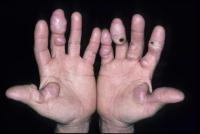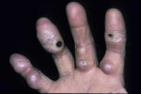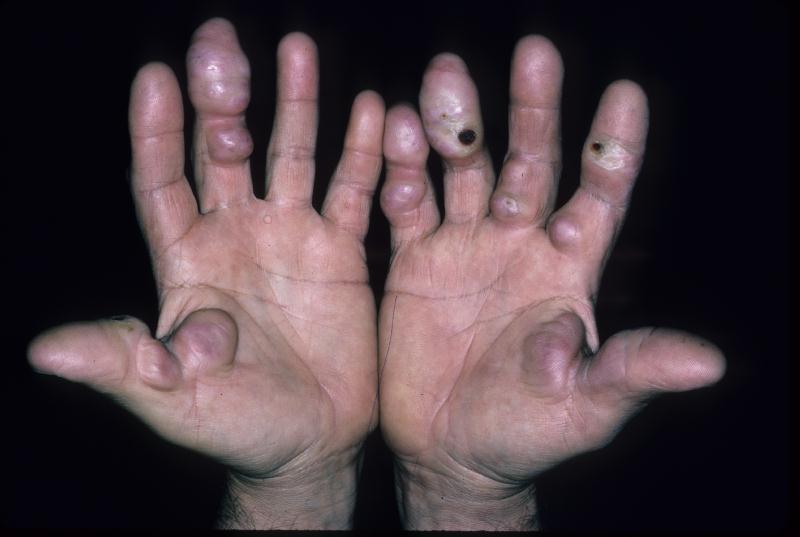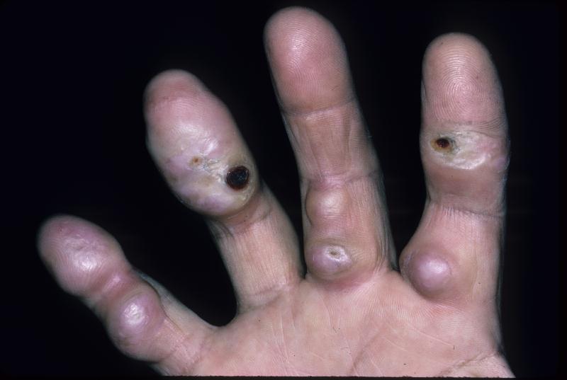 | Effects vary as lesions progress from acute inflammation to fibrosis and ulceration. Lesions on the palms and soles of the feet are often very painful and tender. |
