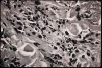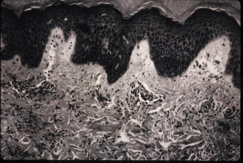 | Typical microscopic findings of fibrosis and perivascular leukocytic infiltration. |