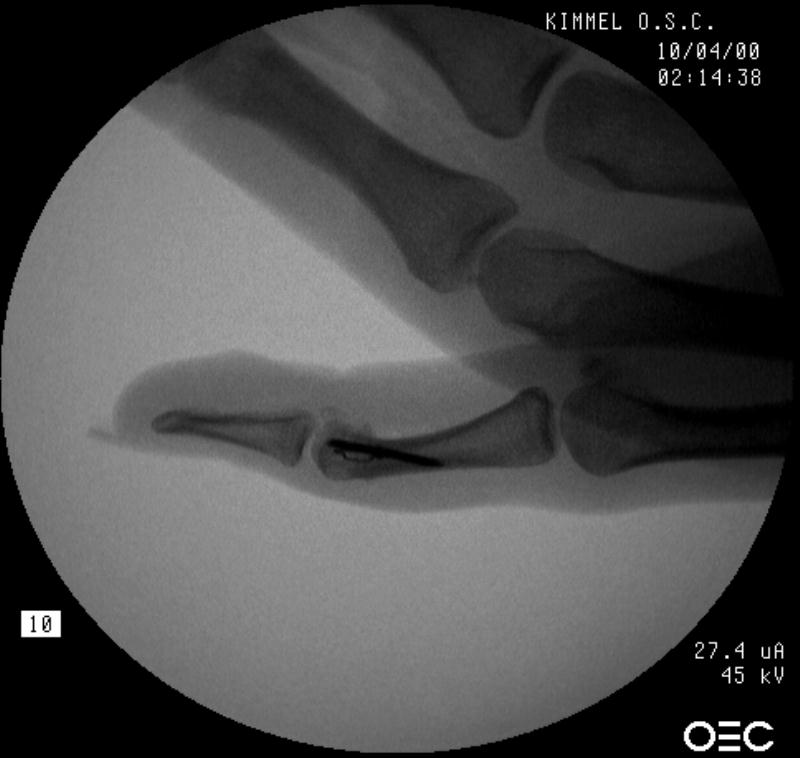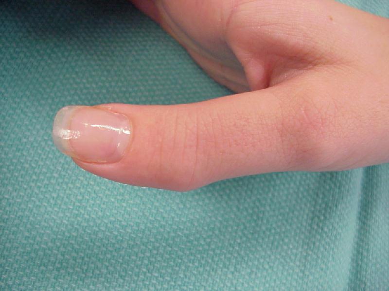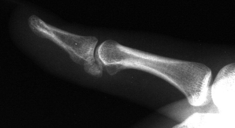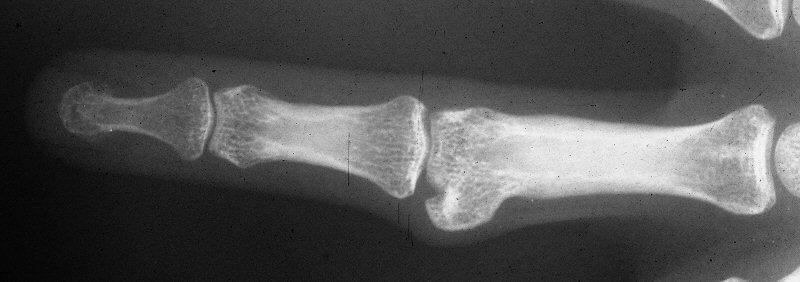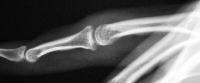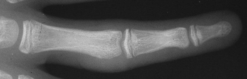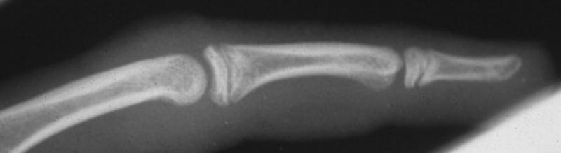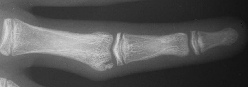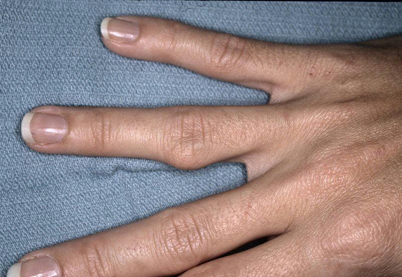 | Case 1. 14 year old boy with radial prominence and ulnar deviation of the middle finger proximal interphalangeal joint. Painless, no history of trauma. |