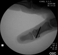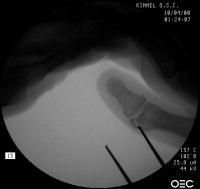 | Radiographs showing well circumscribed calcification at the proximal phalanx collateral ligament origin, 10 degrees of lateral angulation. |