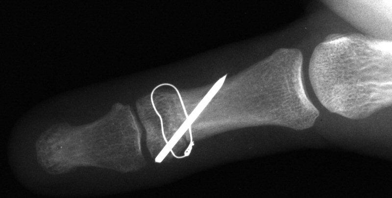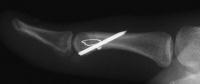 | This was treated with excision of the mass and corrective closing wedge osteotomy of the proximal phalanx. |
