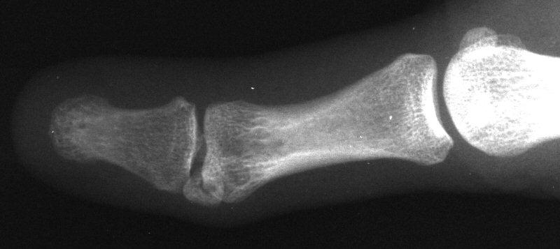 | Radiographs show a juxtaarticular ossification with subchondral cyst formation of the bone interface with the lateral phalangeal head and lateral angulation of the proximal phalanx articular surface. |