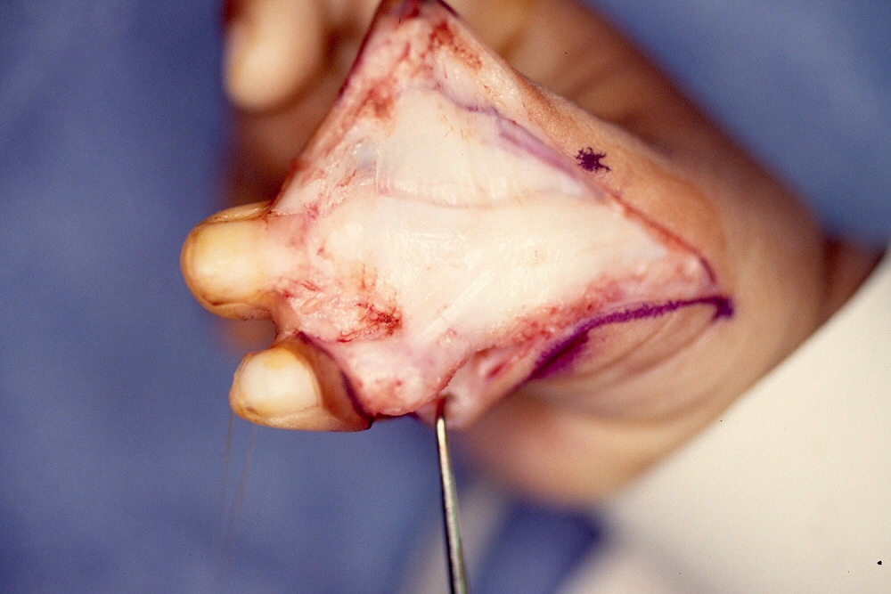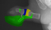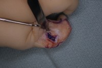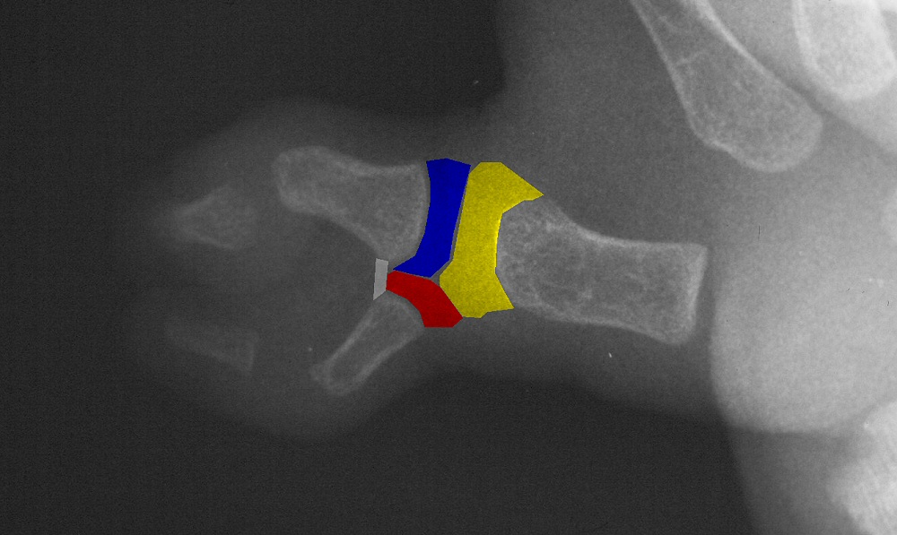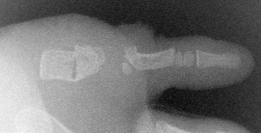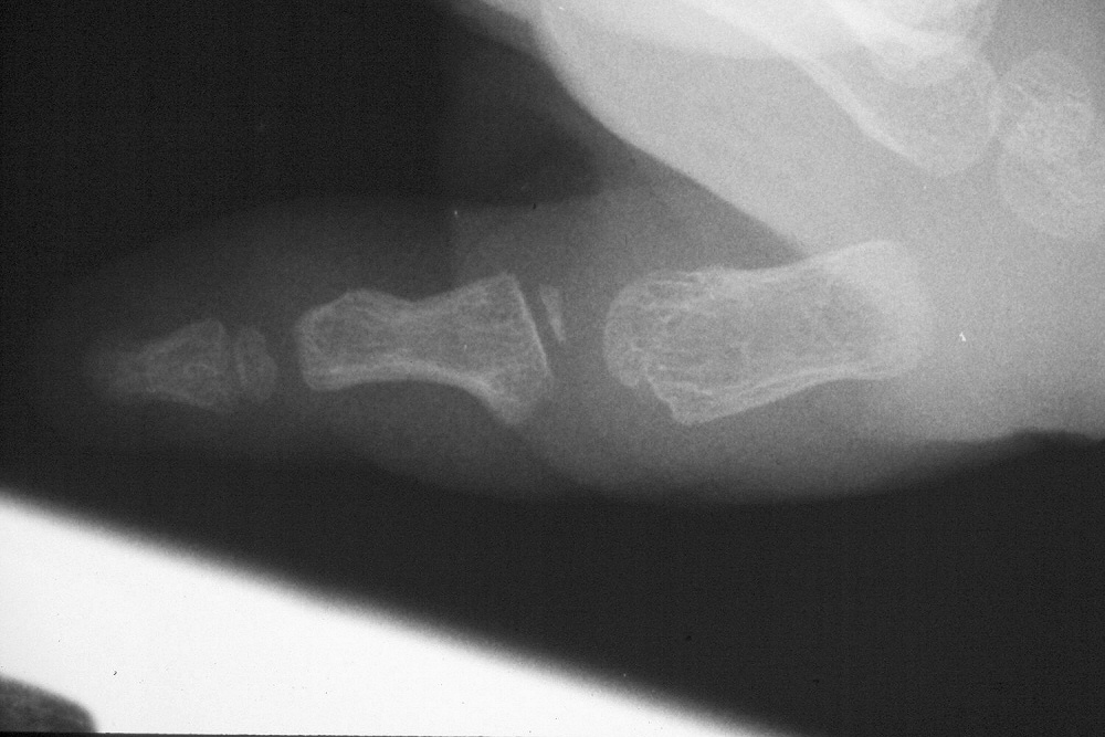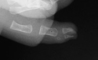 | Case 3. Wassell II duplication of the distal phalanges, reconstructed with proximal phalanx head narrowing, closing wedge osteotomy and radial collateral ligament reconstruction from the deleted segment. |