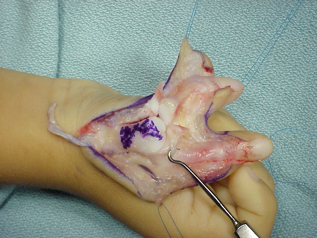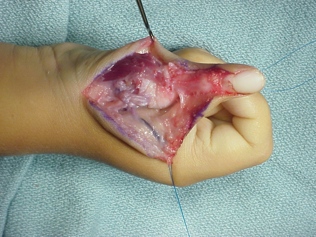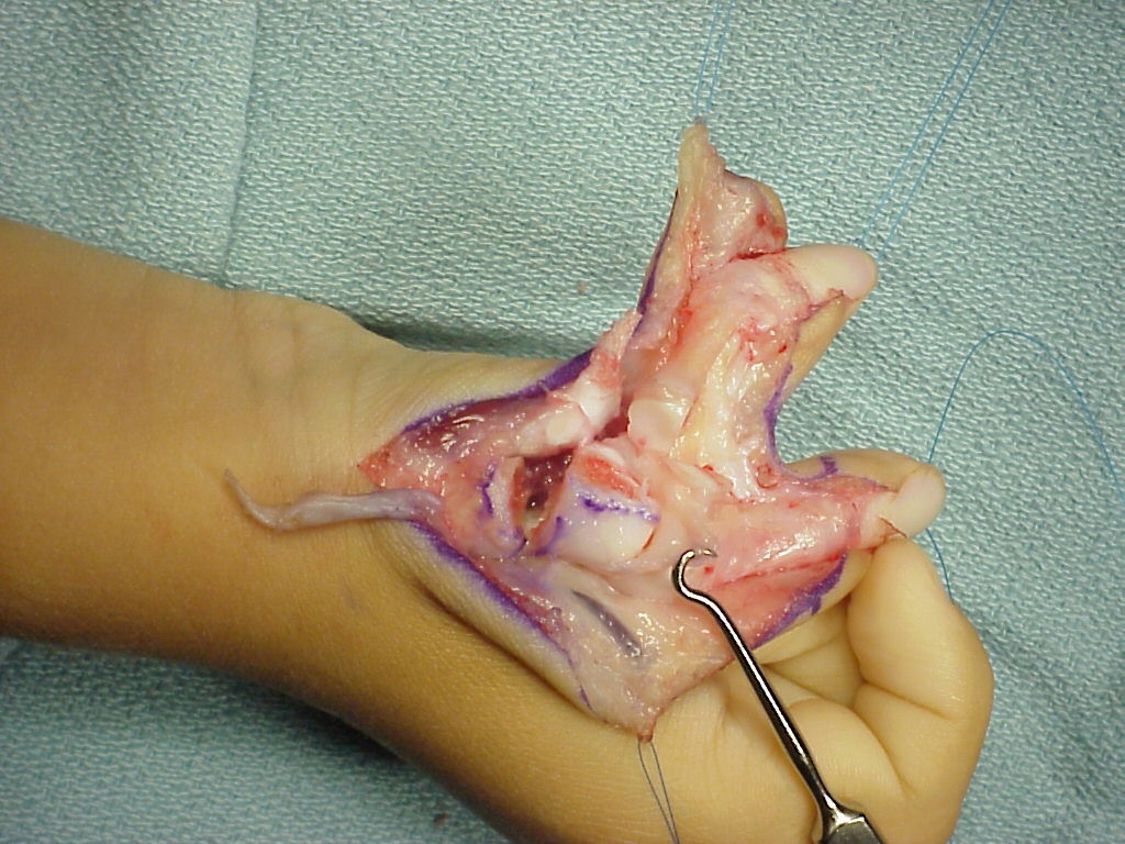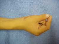 | Thumb polydactyly usually results in a zig-zag radial/ulnar deviation deformity due to angulation of the affected joint surfaces which persists after simple ablation of the extra thumb parts. A more cosmetic reconstruction can be achieved using a combination of osteotomy and collateral ligament reconstruction. Common late issues are lack of IP motion and small thumb tip, which becomes more of an issue with more distal levels of duplication (lower Wassell type). |
