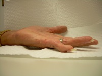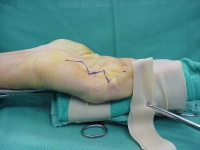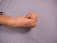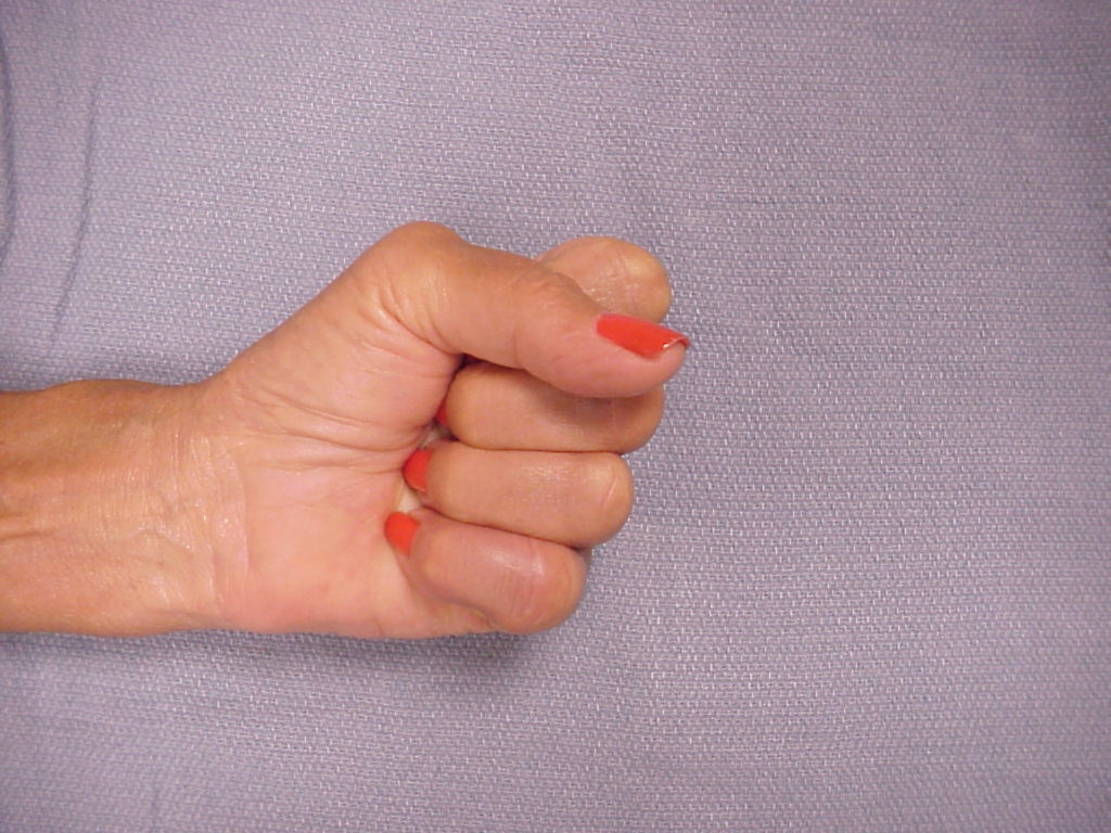 | Range of motion five years postop: soft snapping, loss of full PIP flexion, rubbery DIP flexion contracture. Palmar prominence of the proximal phalanx head due to hyperextension may be confused with a Dupuytren's nodule: |
