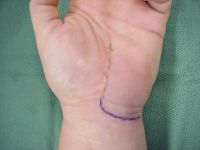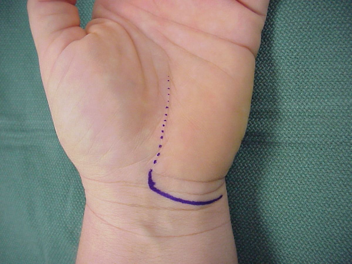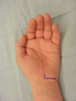 | Case 1. Palmaris brevis flap. This patient had worsening tenderness, pain and paresthesias following open carpal tunnel release done elsewhere. The old incision (dotted) was used with a proximal transverse extension. |