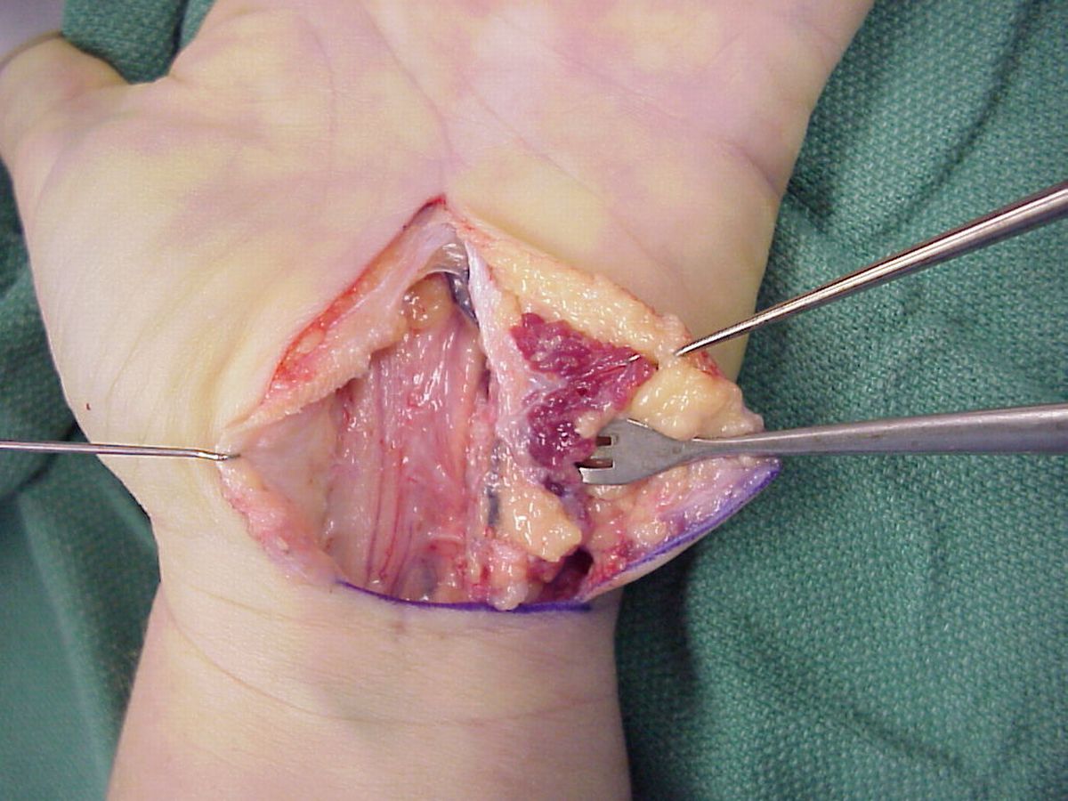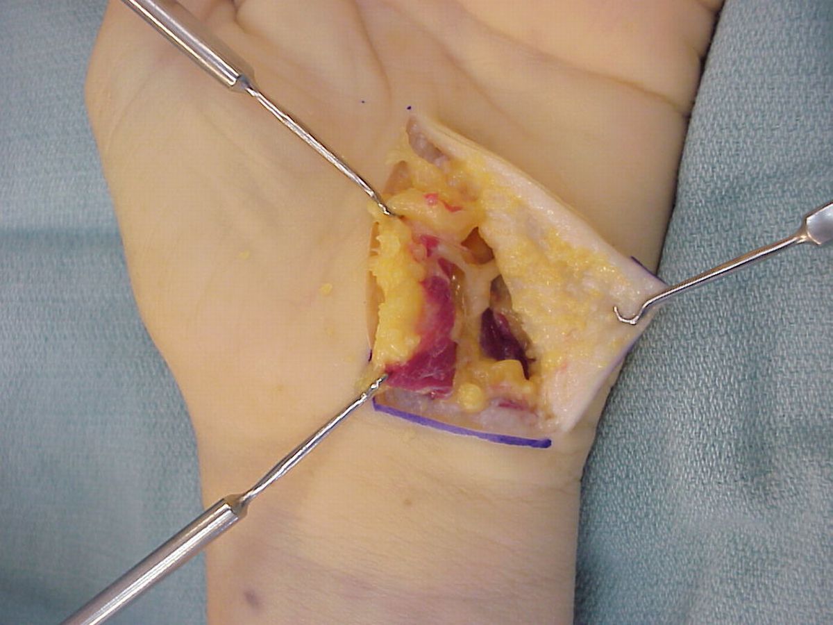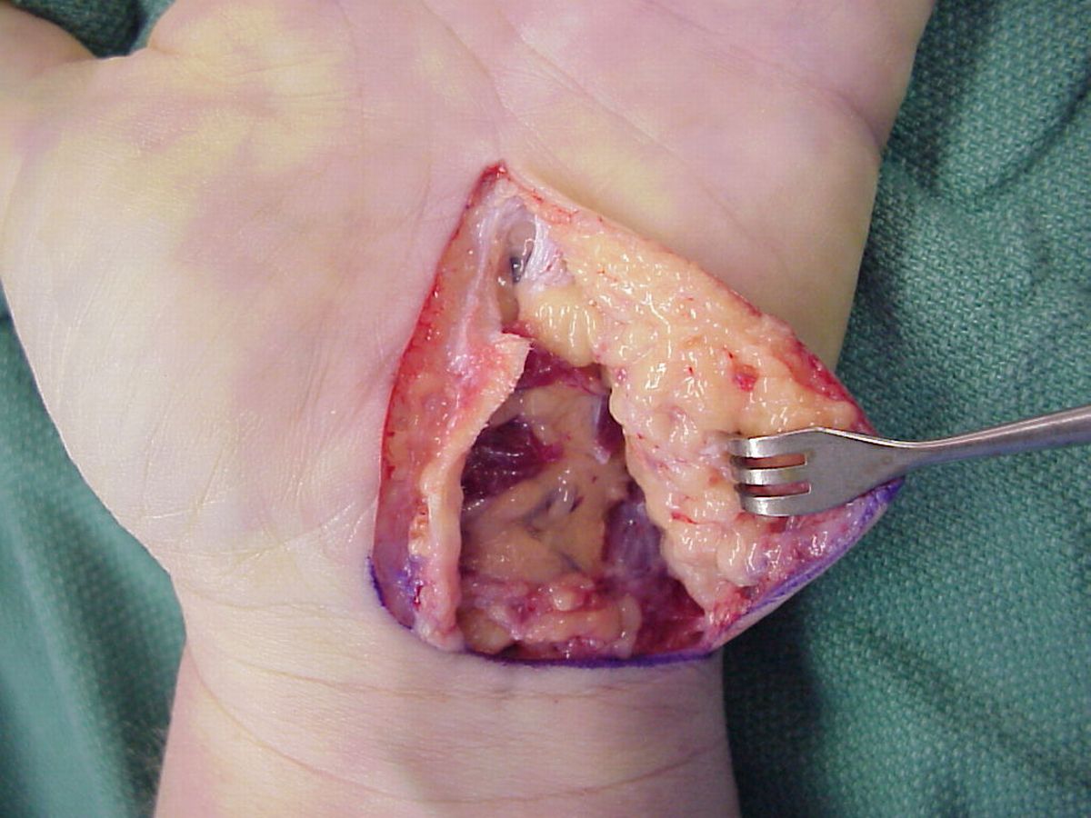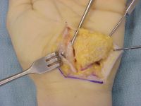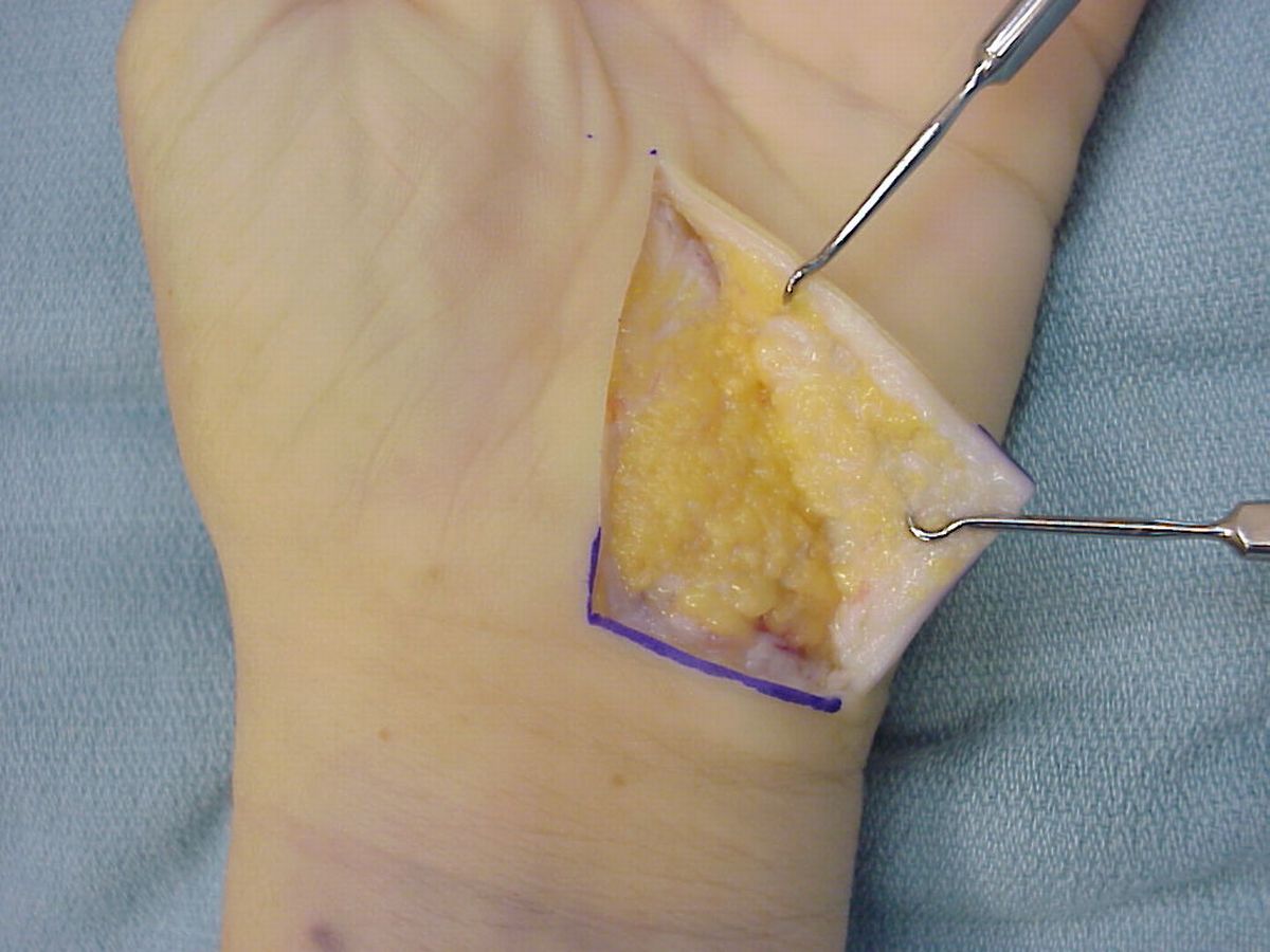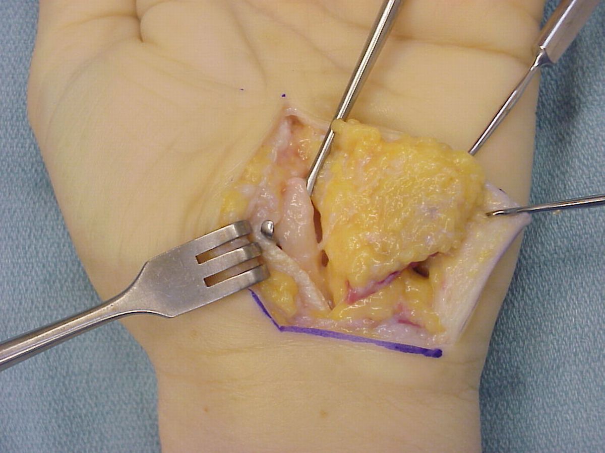 | Fat pad elevated en bloc with palmaris brevis muscle. |