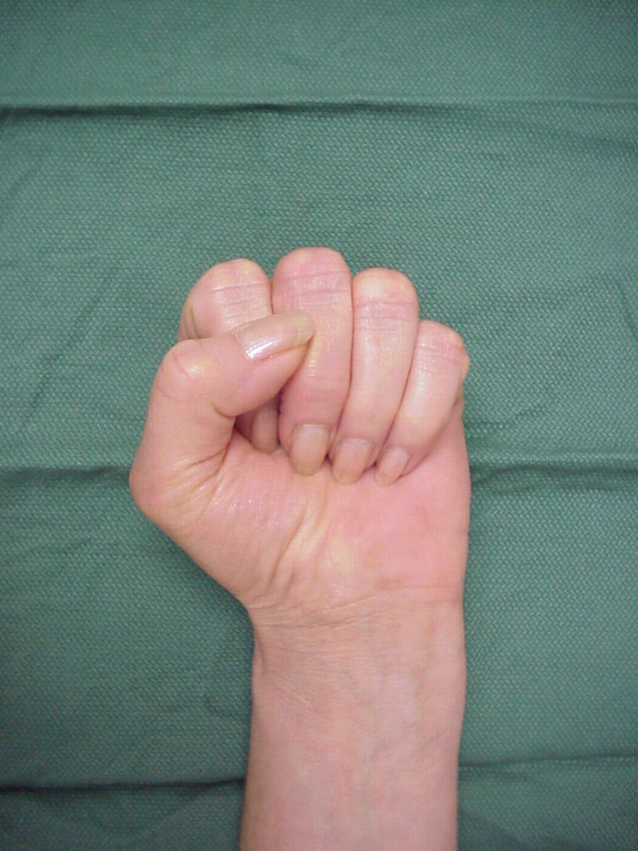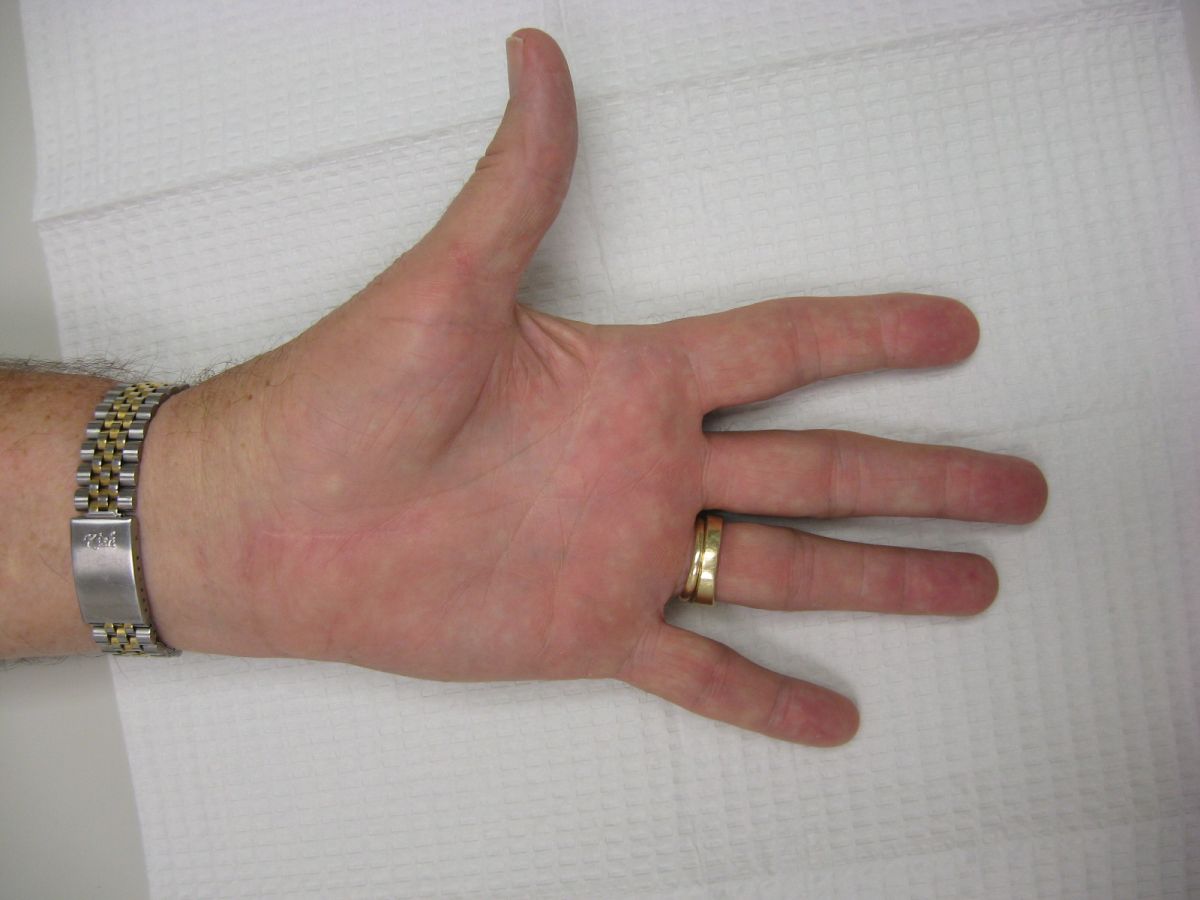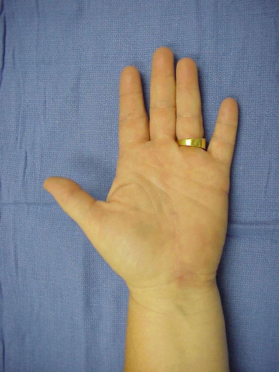 | Late result. The hypothenar skin flap was indurated for several months before resolving, one of the issues with this particular technique. |