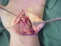 | The flap is turned over like a page in a book on an ulnar artery axis, the fat pad surface facing the nerve. The original ulnar border of the flap is sutured to the undersurface of the radial leaf of the transverse retinacular ligament. |