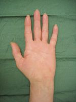 | Case 3. Hypothenar fat pad flap. This patient was referred for constant paresthesias and hypesthesia following endoscopic carpal tunnel release performed for nocturnal paresthesias. |