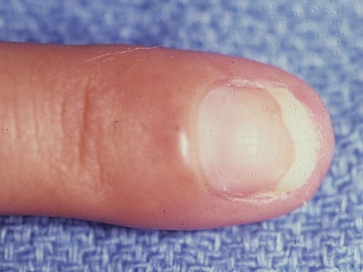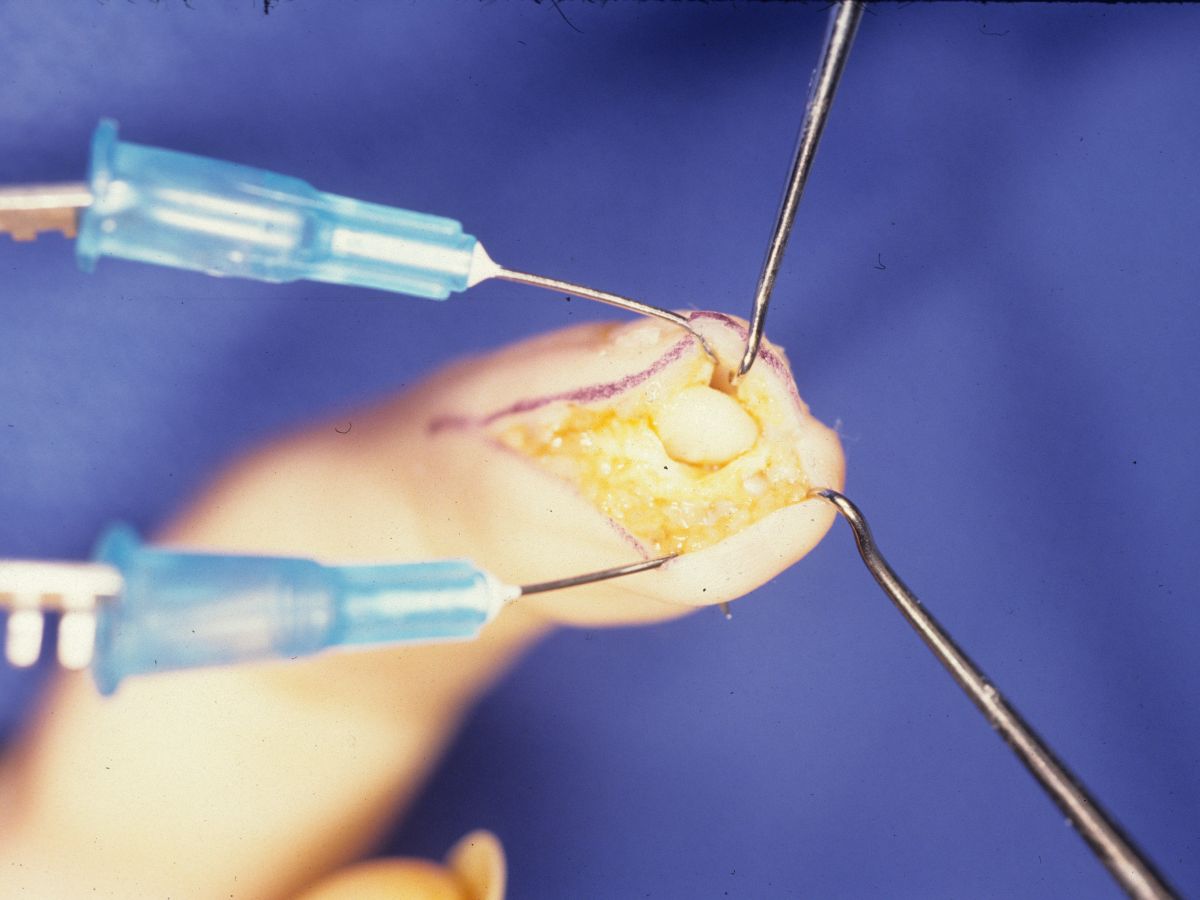 | A typical whitish smooth epidermal inclusion cyst was found protruding from the tuft of the distal phalanx. |