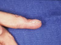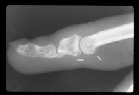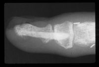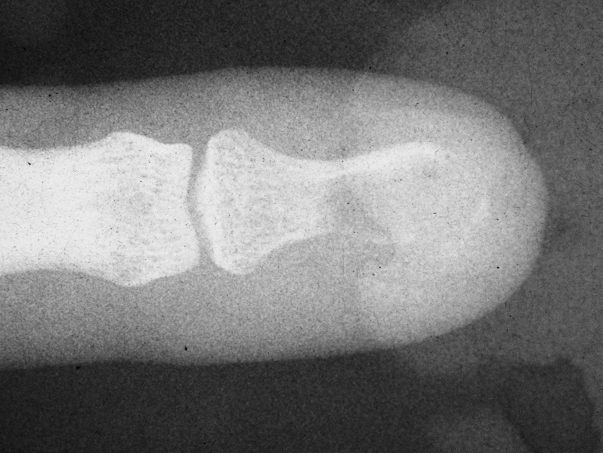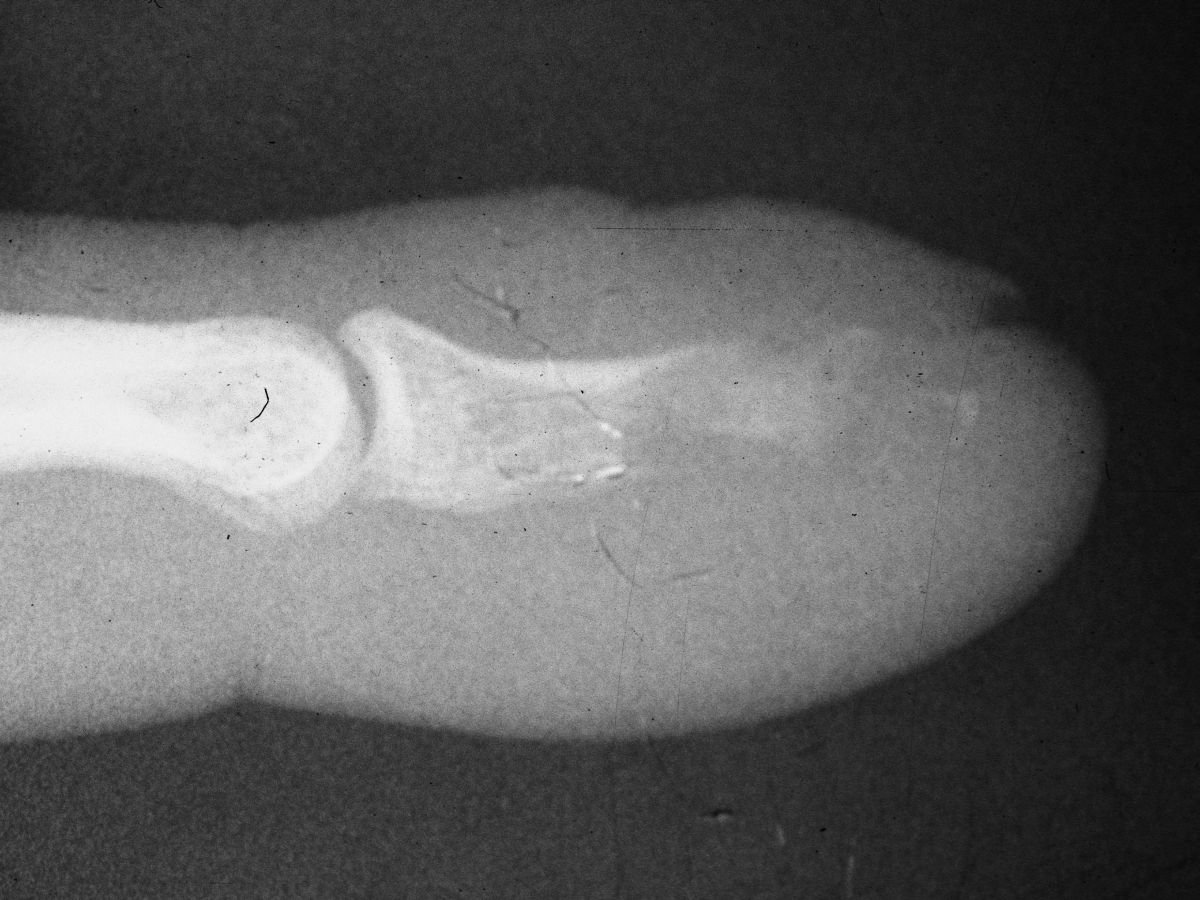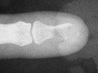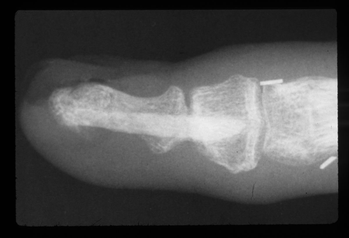| Xrays show loss of much of the distal half of the distal phalanx, with cortical disruption. |