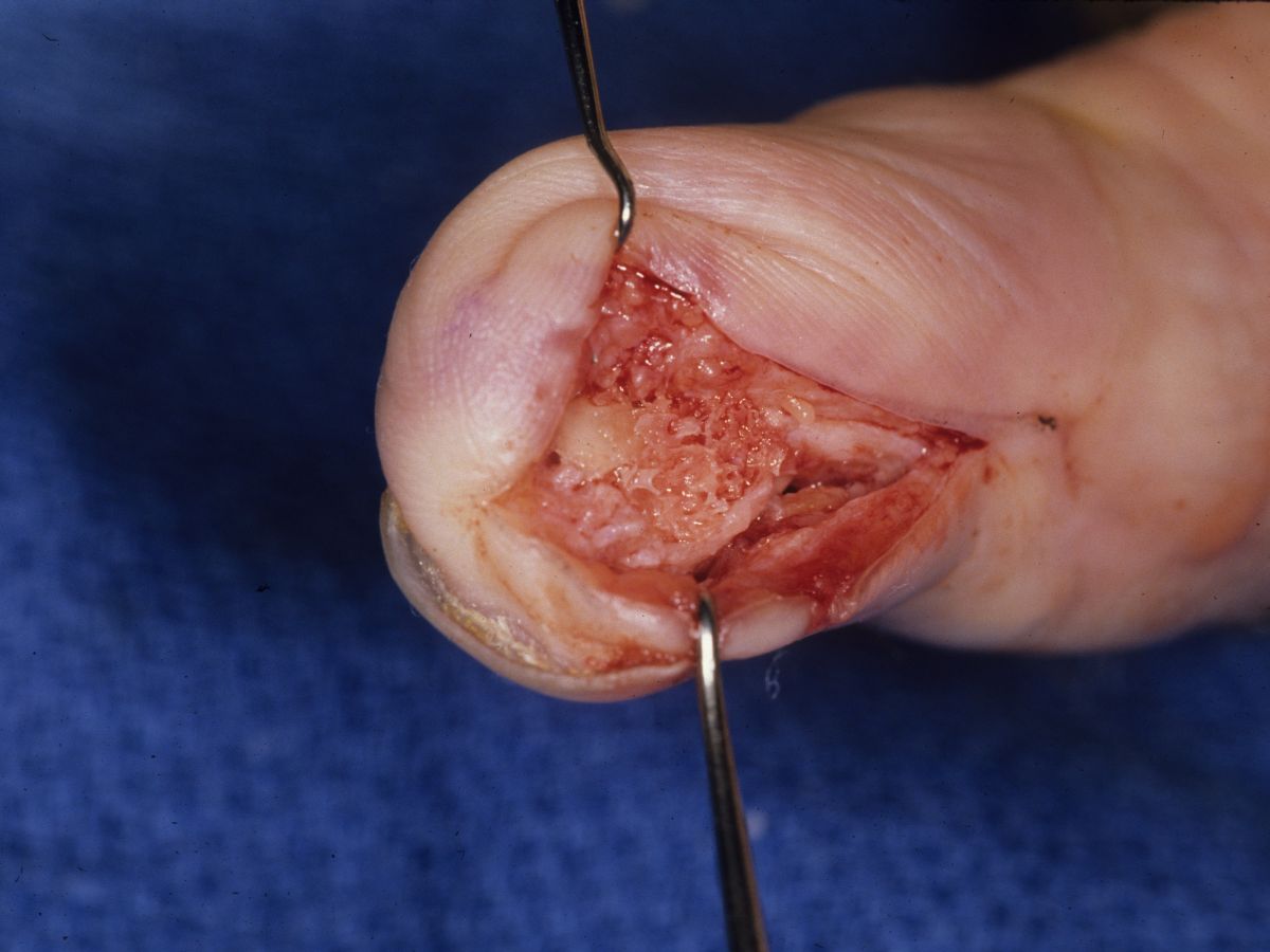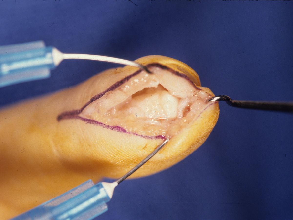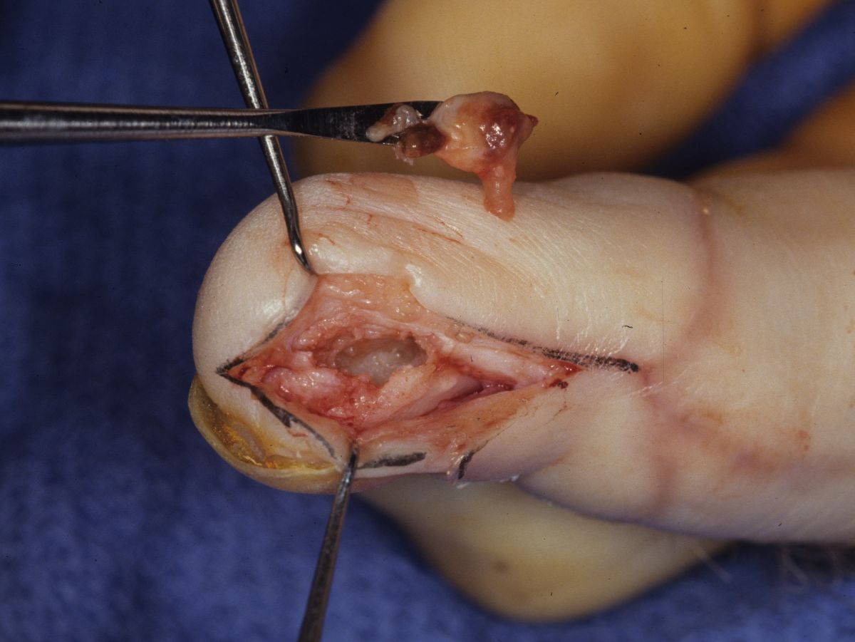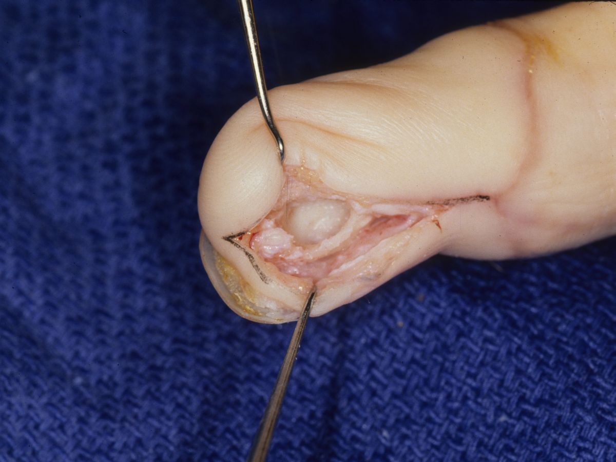 | This was approached through a midlateral incision extended around the tip to allow direct access to the nail bed. |