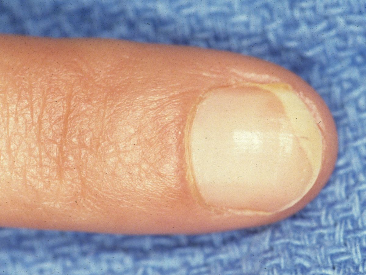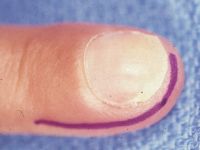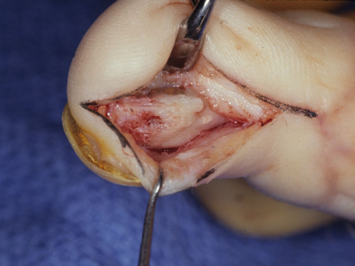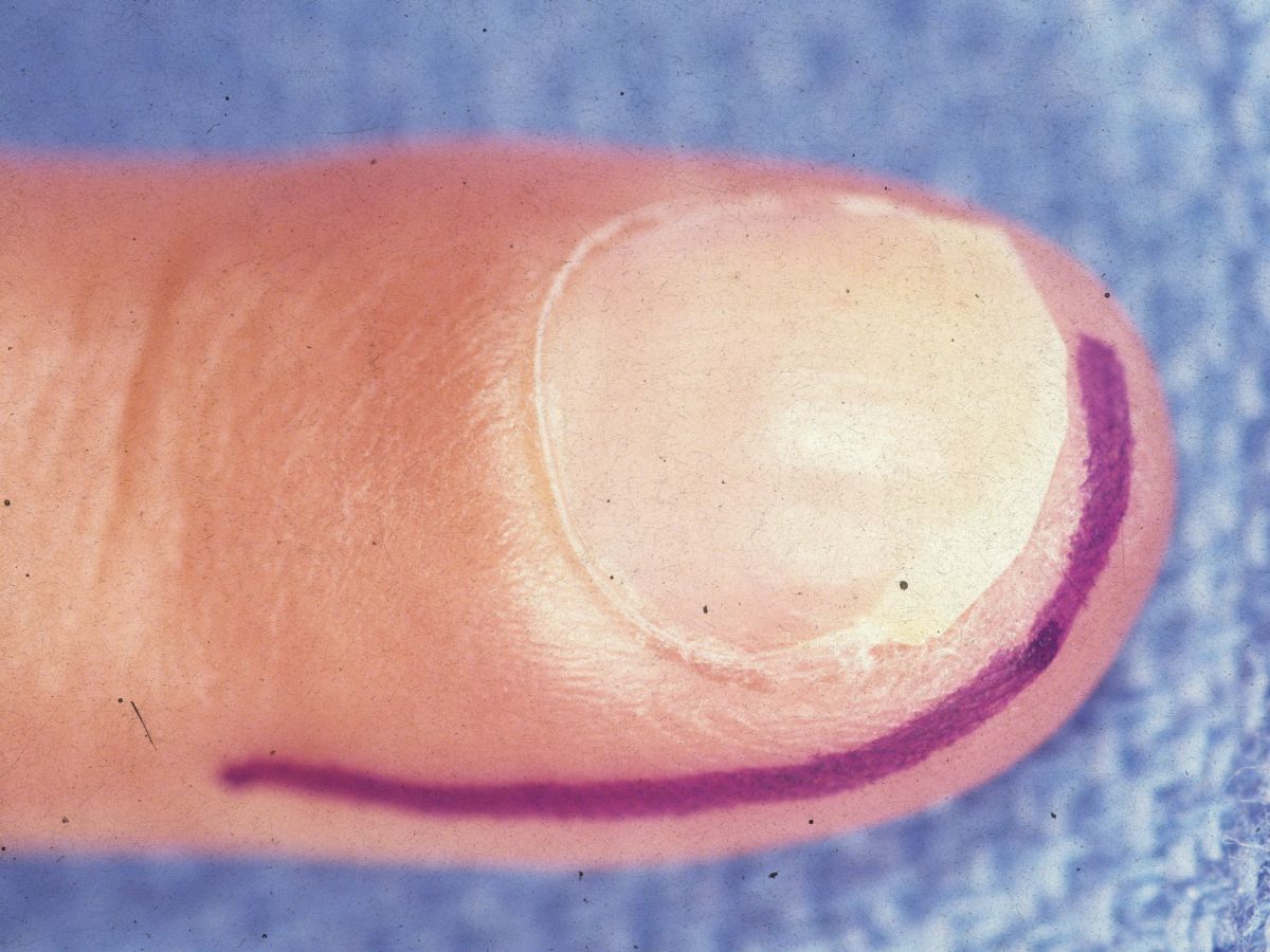 | This was approached through a midlateral incision extended around the tip to allow direct access to the nail bed. |