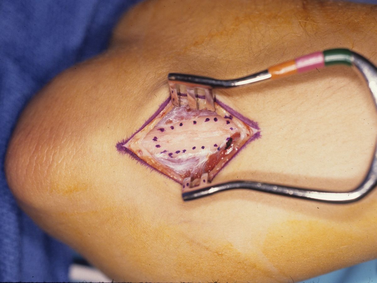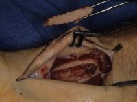| Graft in place. Exposure facilitated by using 25 gauge needles to convert a Heiss to a Gelpi retractor. |