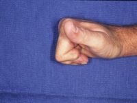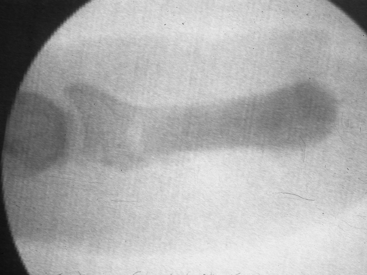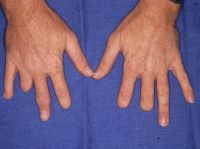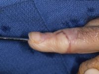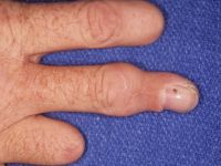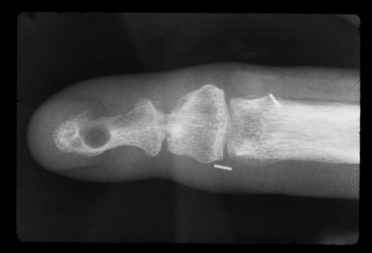 | Late films show only palmar cortical bridging and a lucency in the distal phalanx which was visible in the original films, consistent with an epidermal inclusion cyst. The patient admitted to many open and crushing fingertip injuries over the years in his line of work. |