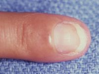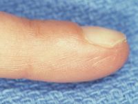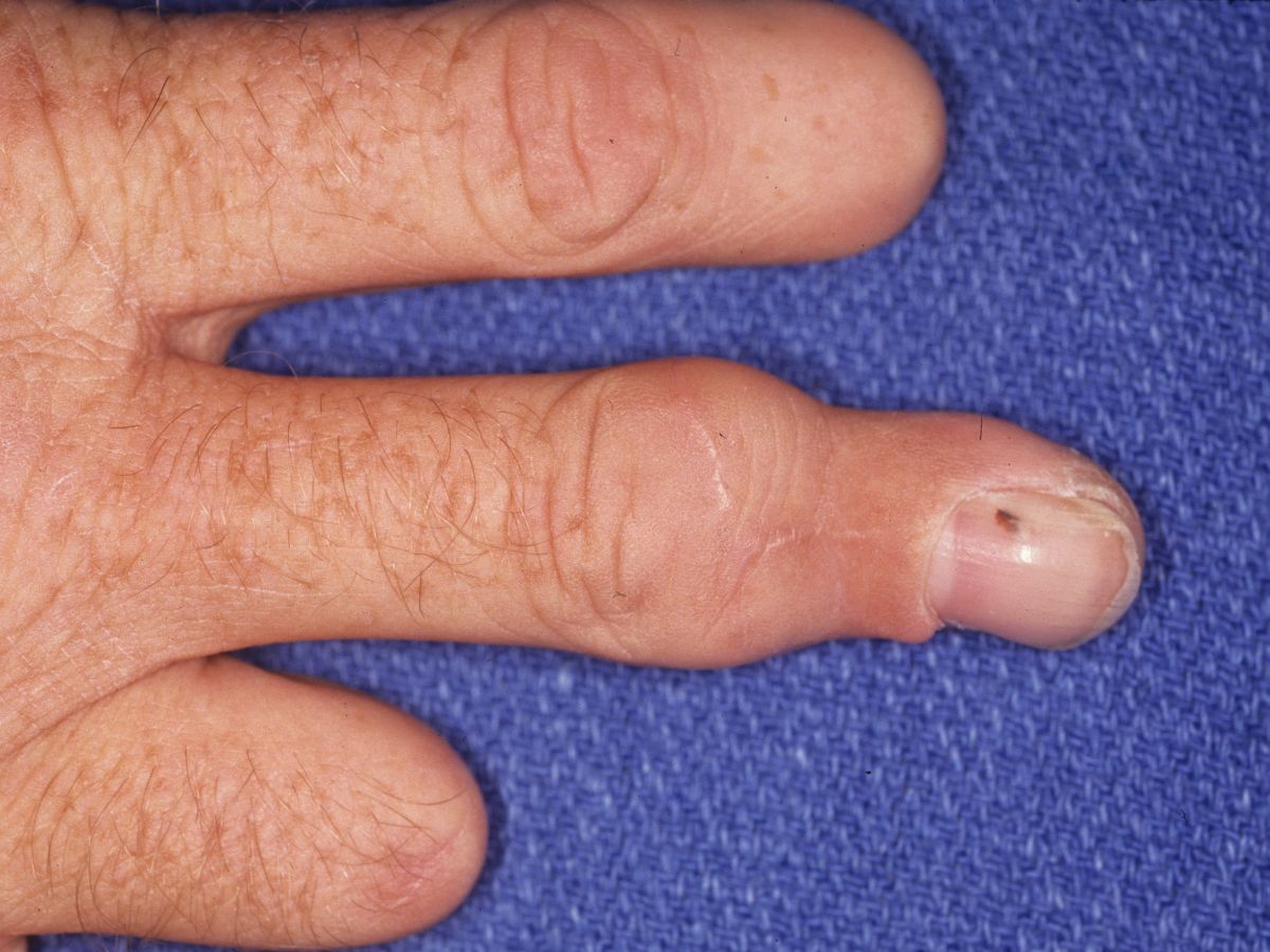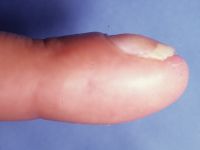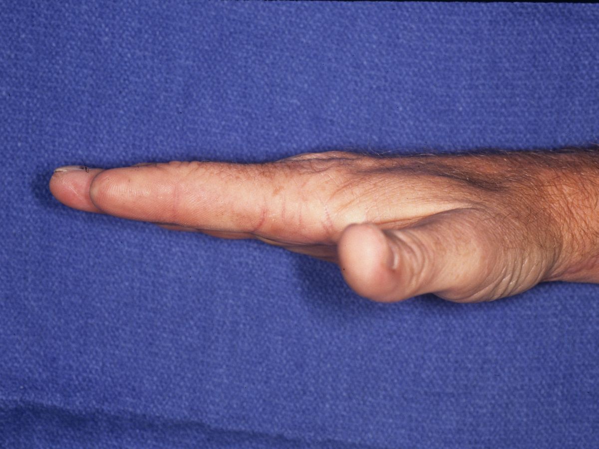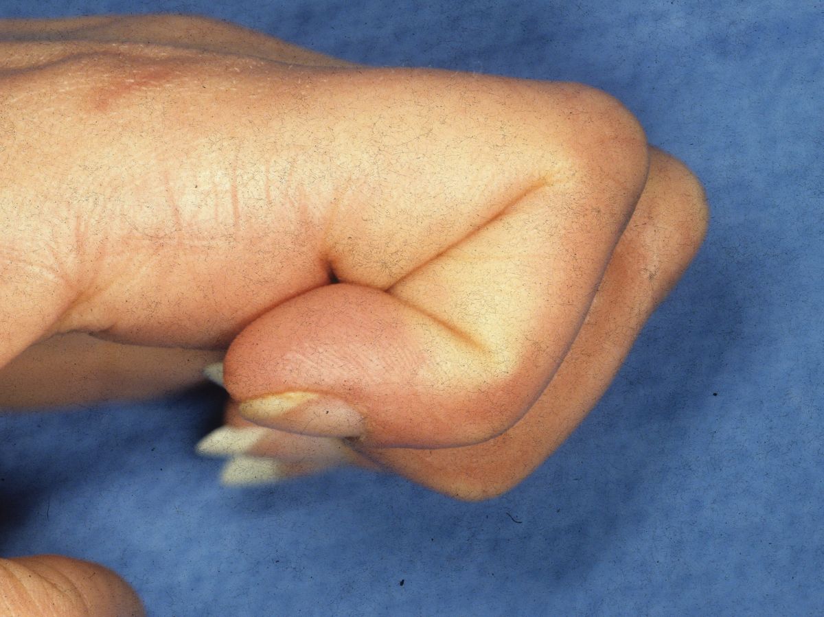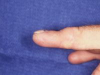| Case 1. This patient presented with a progressive index finger nail deformity years after an open crush injury of that fingertip. |