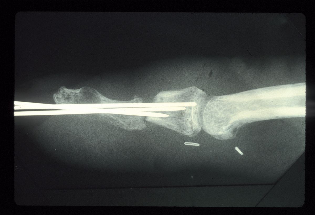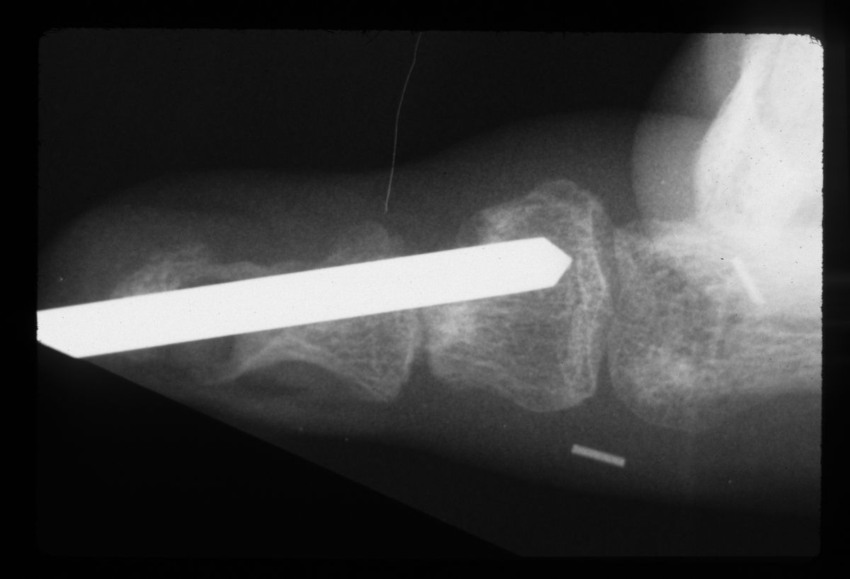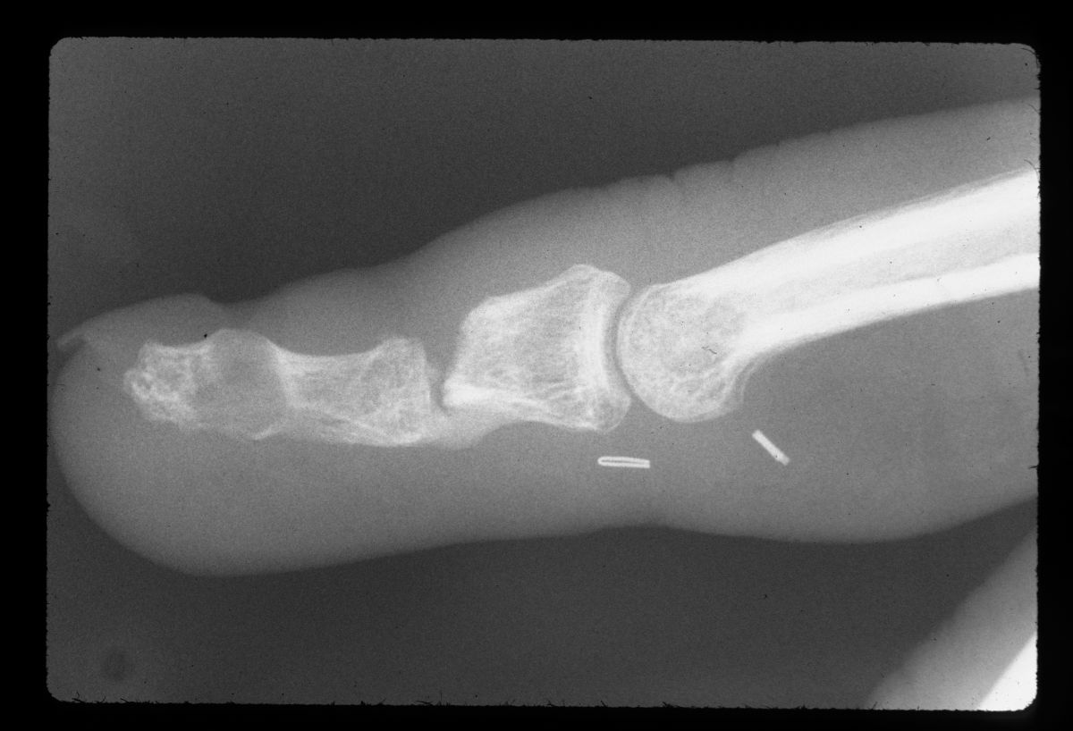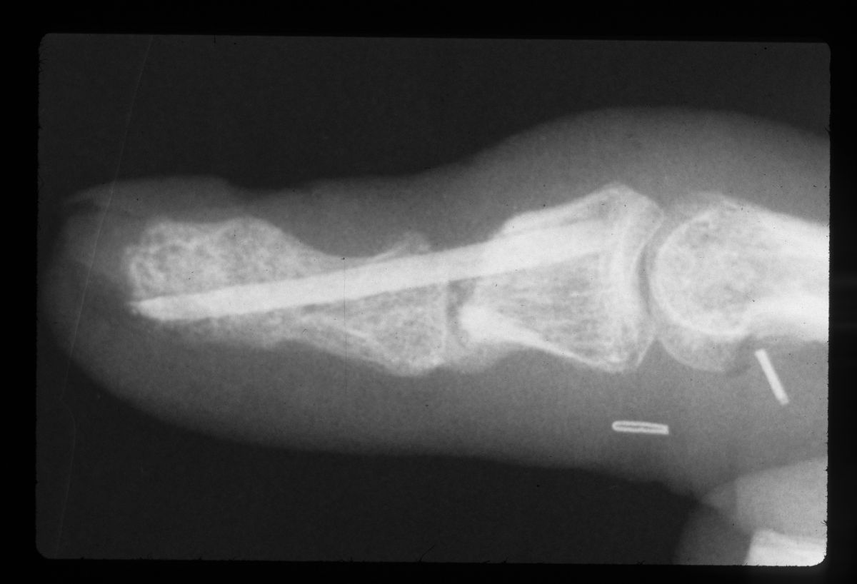 | The ring distal phalanx was secured to the middle phalanx remnant of the middle finger. |