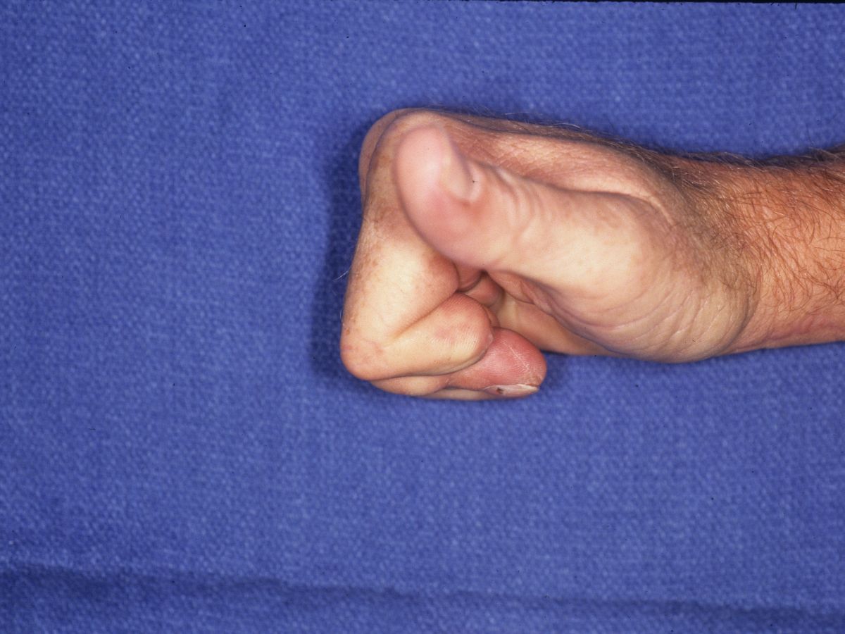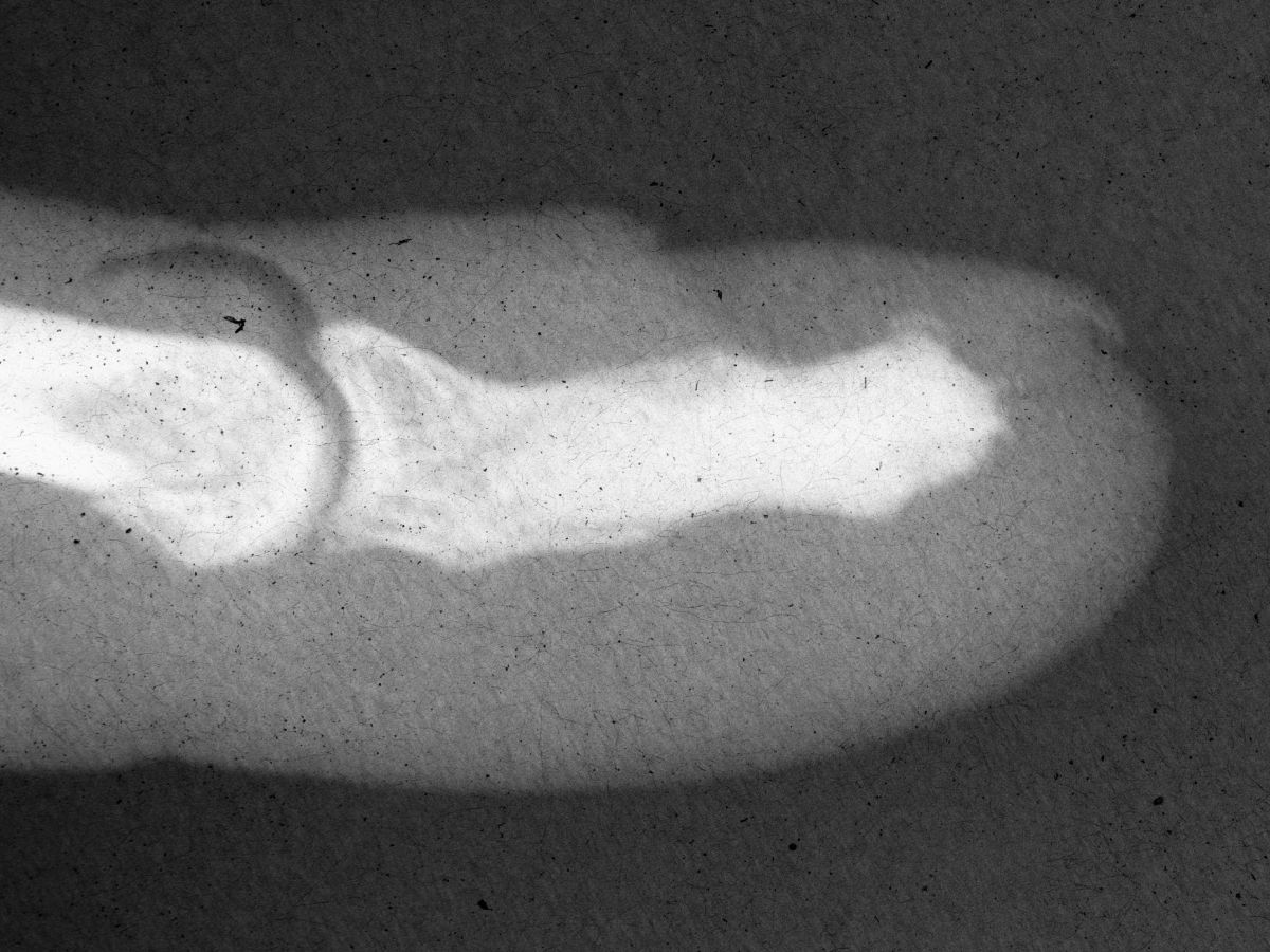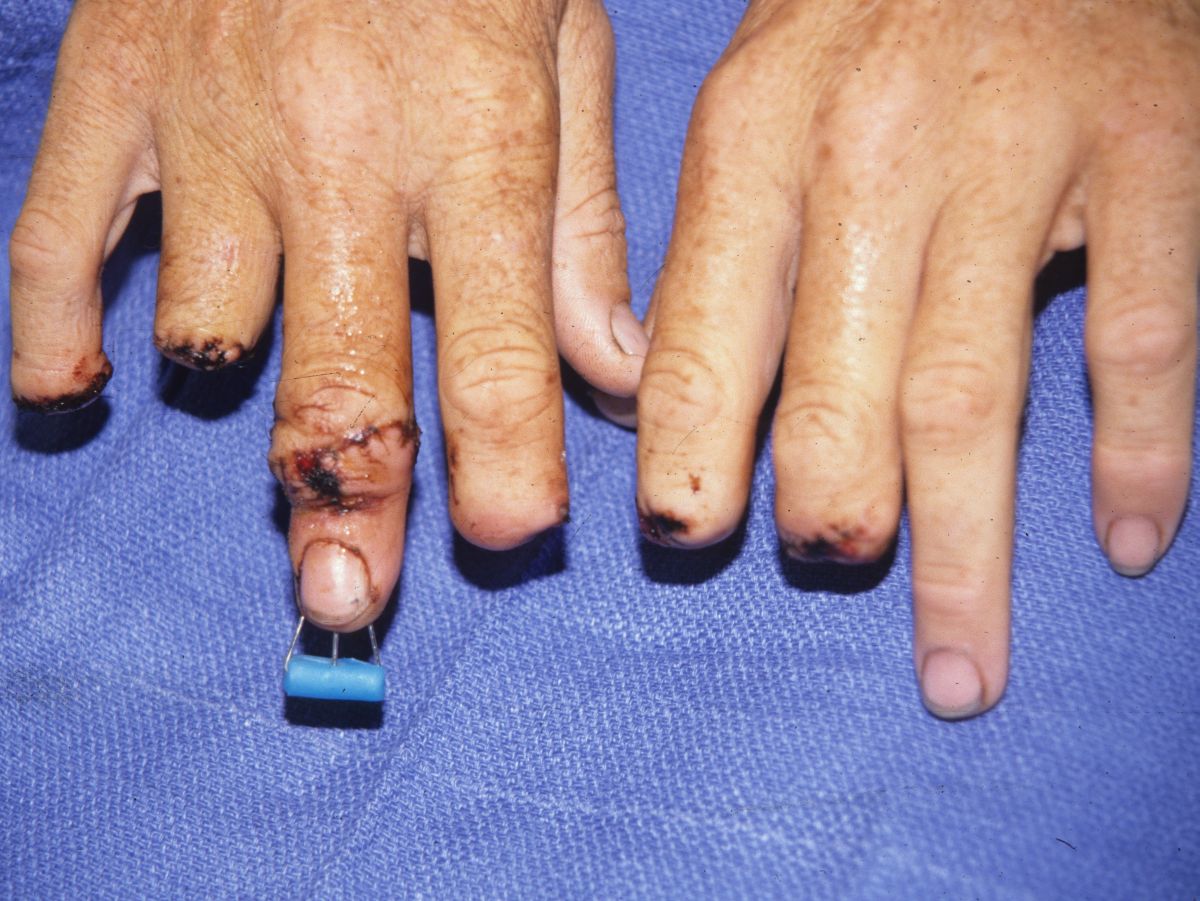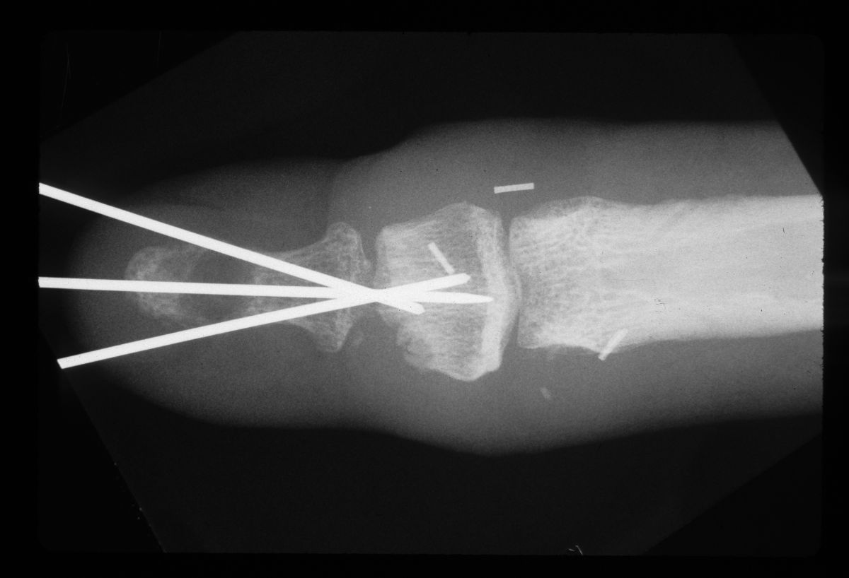 | The ring distal phalanx was secured to the middle phalanx remnant of the middle finger. |