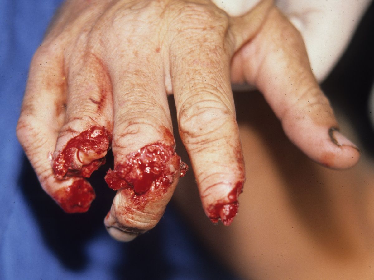 | Although the middle fingertip is attached, it was devascularized and the palmar soft tissues were destroyed. |
