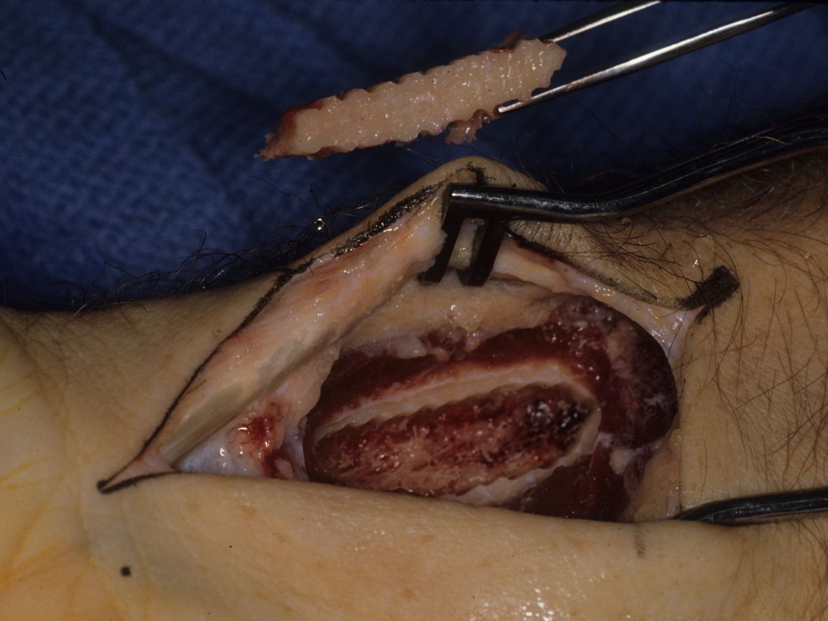 | A cortical strut graft and cancellous bone was harvested from the distal radius. |