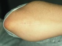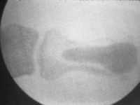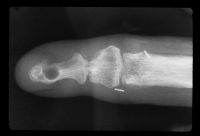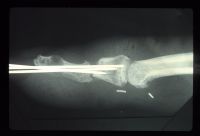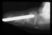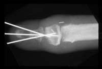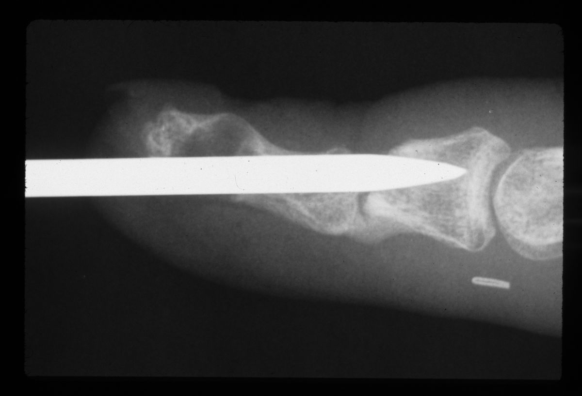 | That pin was used as a drill and then replaced with the bone graft. The cyst defect was packed with cancellous bone. |
