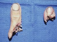 | Case 2. These were the only recognizable digits recovered from the scene after this patient sustained bilateral finger amputations from a rip-cut blade rotating saw injury. |