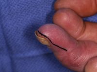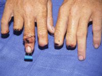 | The amputated ring finger was replanted on the middle finger stump using a modified wraparound technique. |
