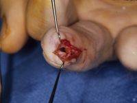 | A bone graft was used to ablate the tumor and reinforce the bone junction. A midlateral tip incision was used on the side opposite the replantation vascular repair. A midline palmar incision was not used because of concerns regarding devascularizing the tip on the opposite side of the vascular repair. |