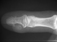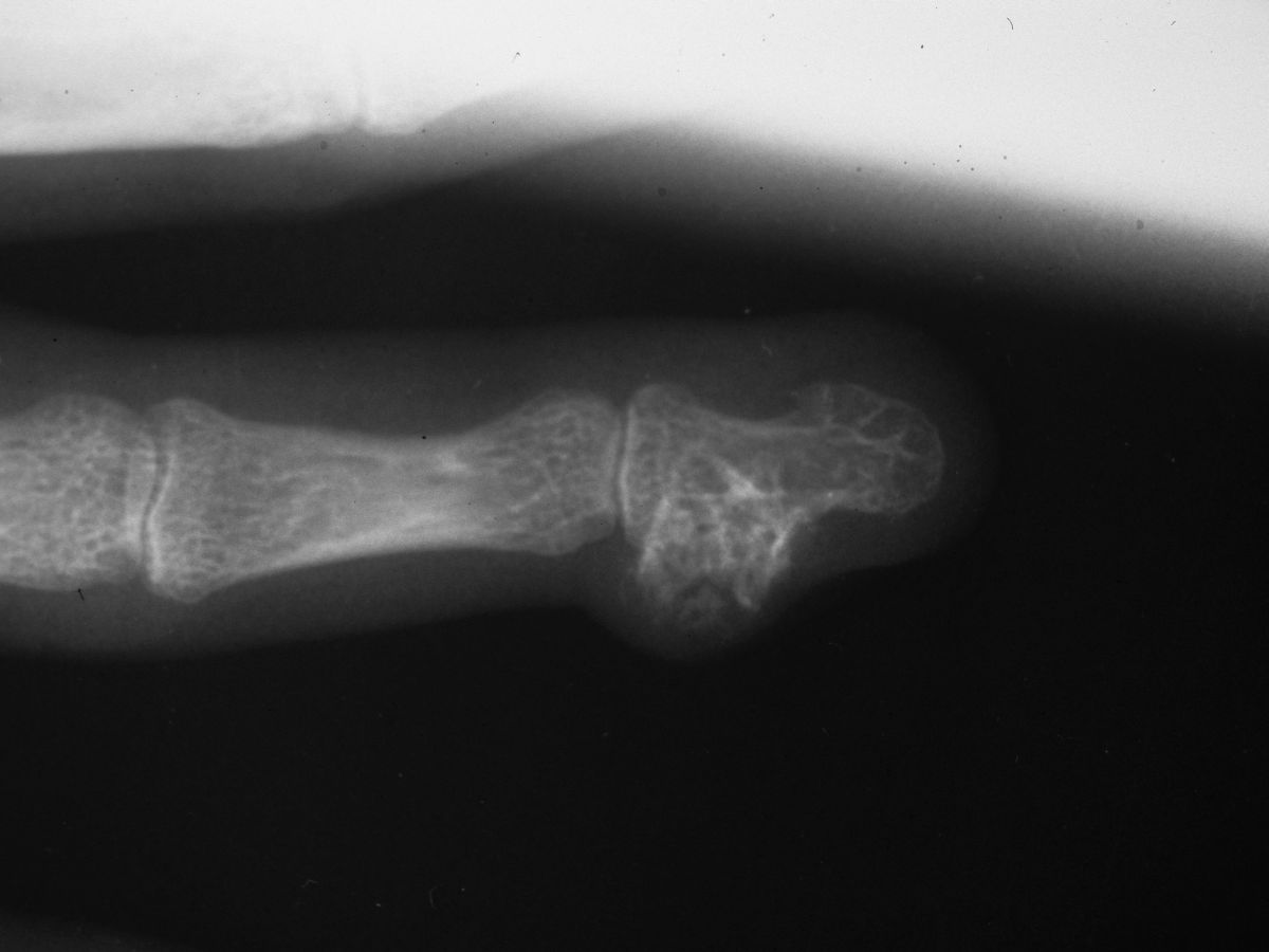 | Case 2. Osteochondroma presenting as a pulp mass. The patient believed that they had a splinter or foreign body in the finger from a forgotten incident. |