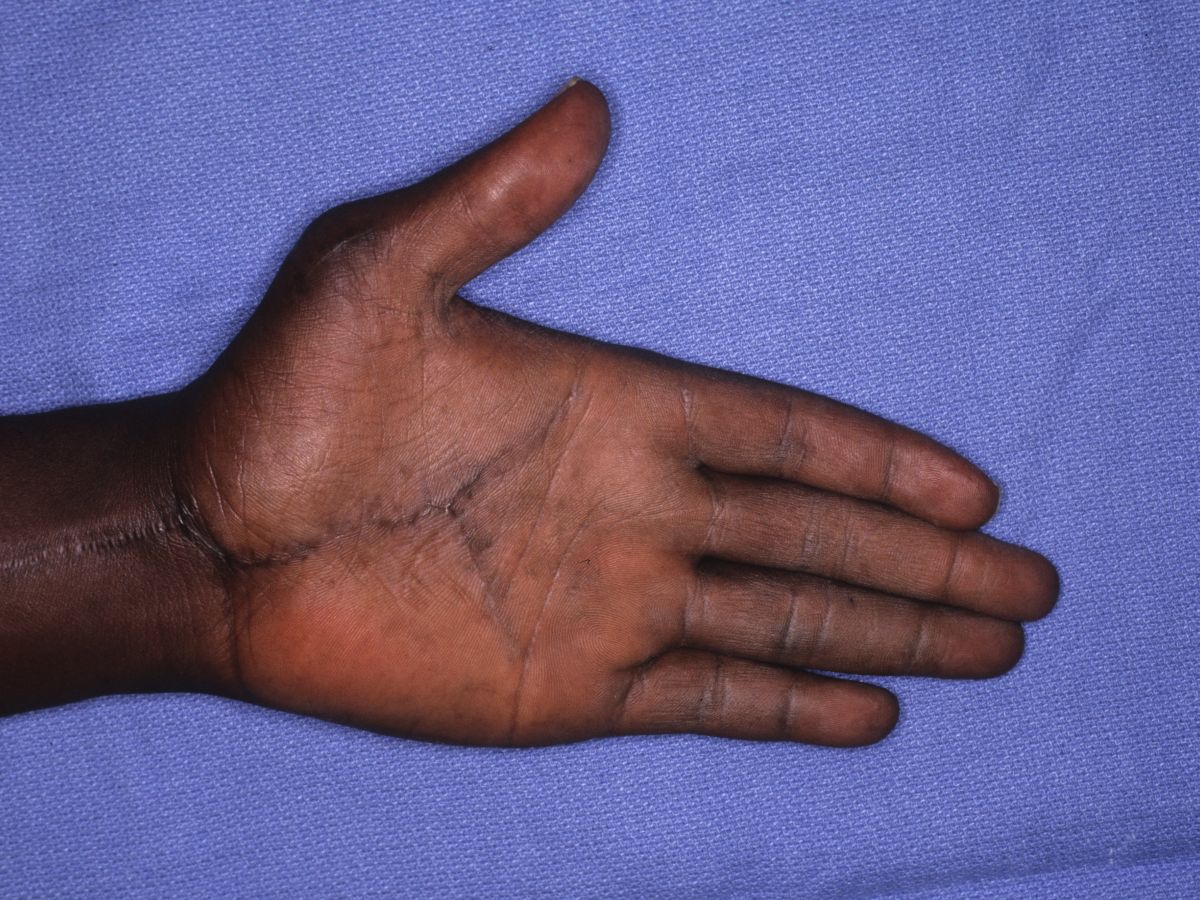 | The wound was excised and the palm explored through an extensile Y incision. The distal median nerve was segmentally absent, and was reconstructed with sural nerve grafts. |