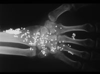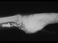 | This young adult presented one year after sustaining a close range gun shot injury of his left palm, which had been treated with local wound care. No records were available, and he was vague about the details of the injury. He had complete median nerve loss, a stiff hand and a healed wound in the central proximal palm. Xrays were consistent with retained shotgun pellets, most likely turkey shot (#4 shot, 135 pellets per cartridge). |