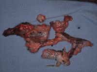 | Debrided tissues were found to include the plastic shotgun cartridge wad along with many pellets. |