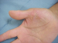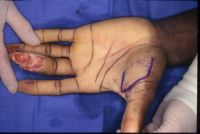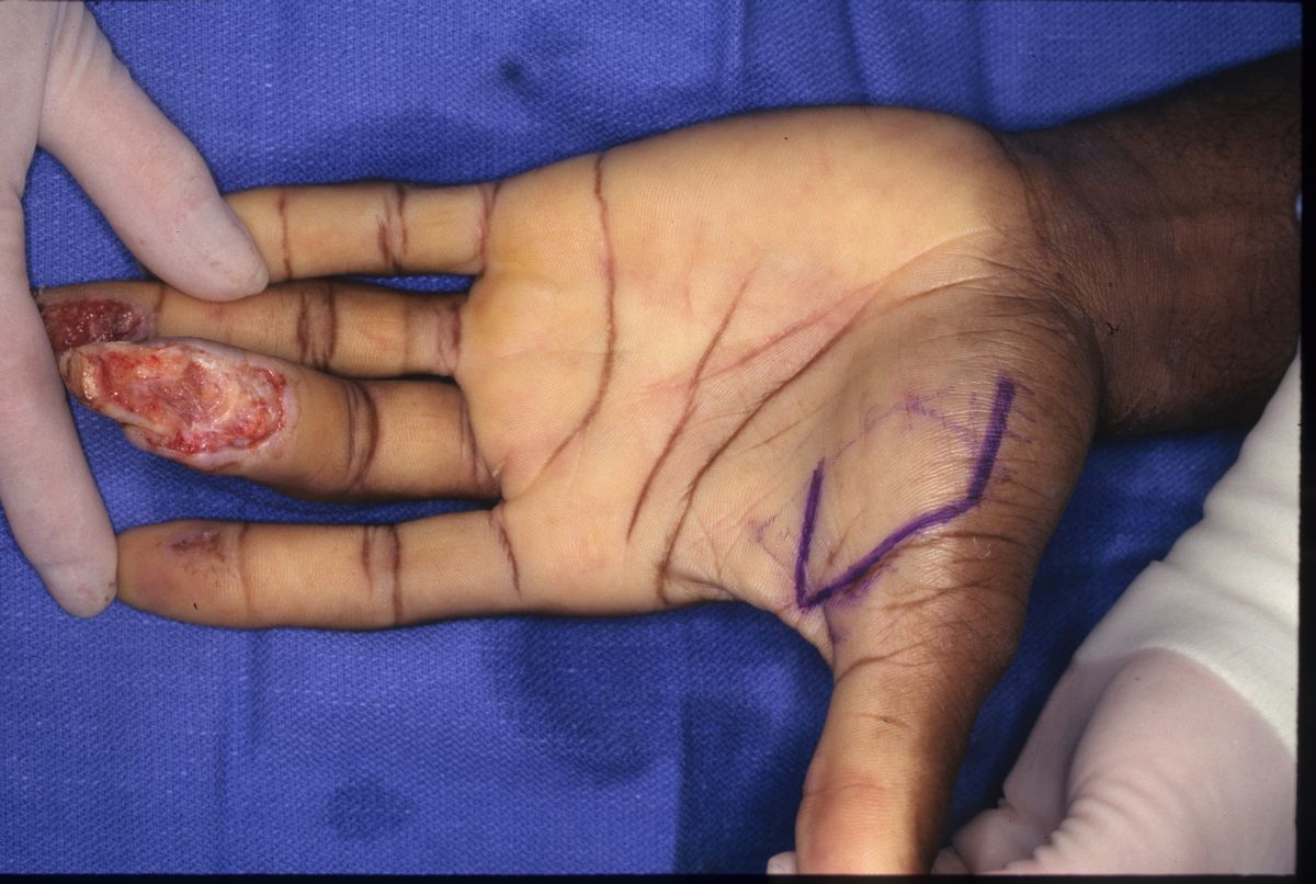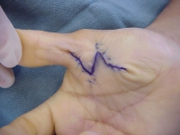 | Case 3. This thenar flap donor site had been closed with a skin graft by another surgeon. The donor site was tight, and the patient had tenderness and Tinel type paresthesias directly beneath the center of the skin graft, clinically consistent with a neuroma in continuity. Here, a plan for graft excision and Z-plasty closure. |