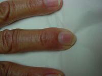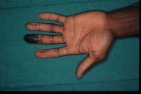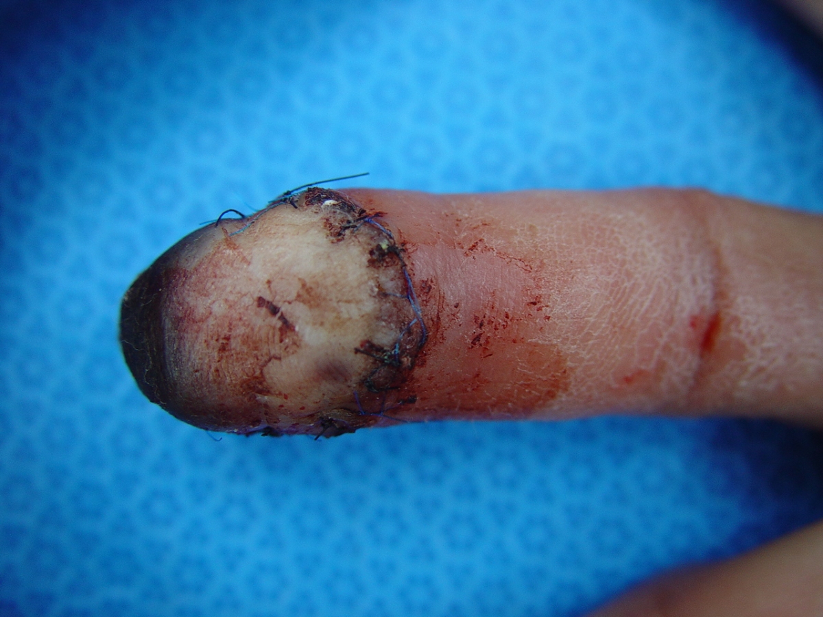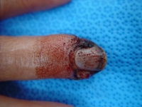 | Case 1. This patient sustained a pulp amputation which was reattached in the emergency room as a composite graft, nonviable at one week. |