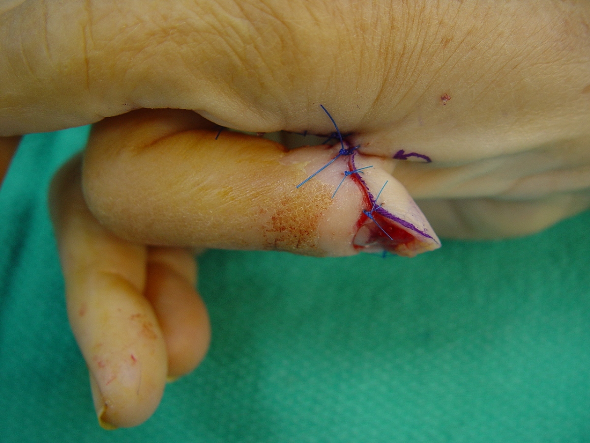 | Case 2. A larger defect including the entire distal phalanx pulp, also a failed composite graft of a palmar oblique saw amputation of the fingertip. |