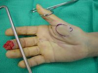 | The defect was excised, the longitudinal tightness released, and the tender digital nerve was covered. |