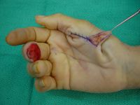 | Flap inset, "bringing the thumb to the finger" with redundant skin in the flap to promote a rounded final tip contour. |
