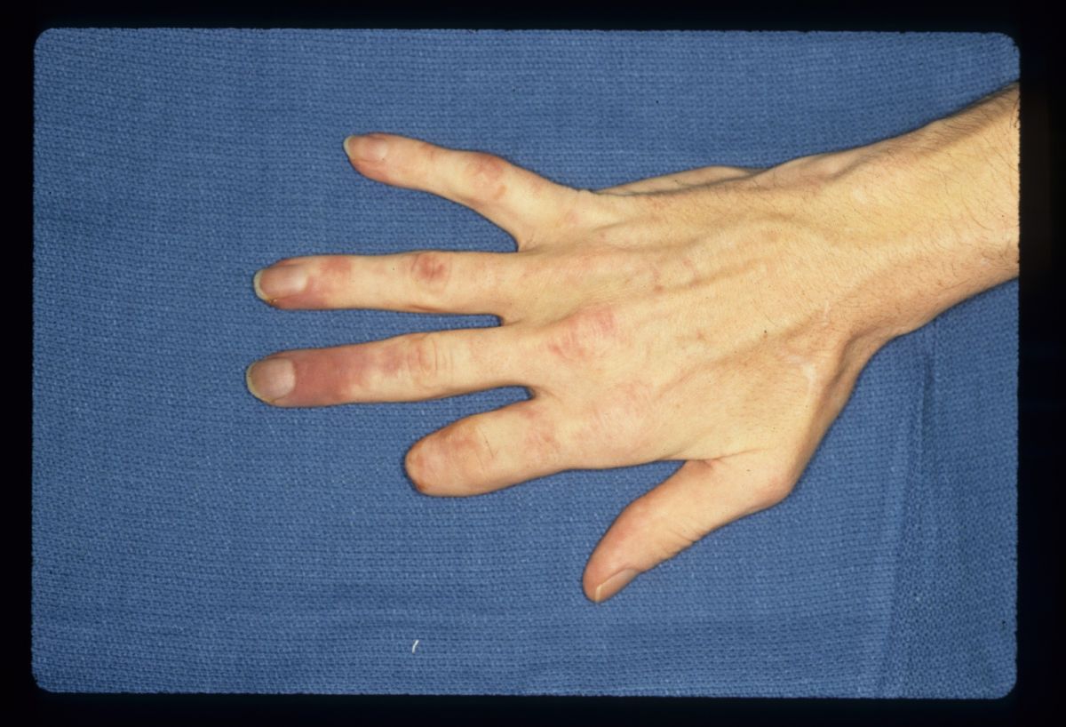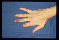 | The wounds were kept clean and dry until demarcation was complete. two months after the initial event, the thumb tip has autoamputated and the first dorsal interosseous muscle has developed ischemic contracture, resulting in a fixed flexion and radial deviation of the index metacarpophalangeal joint. |