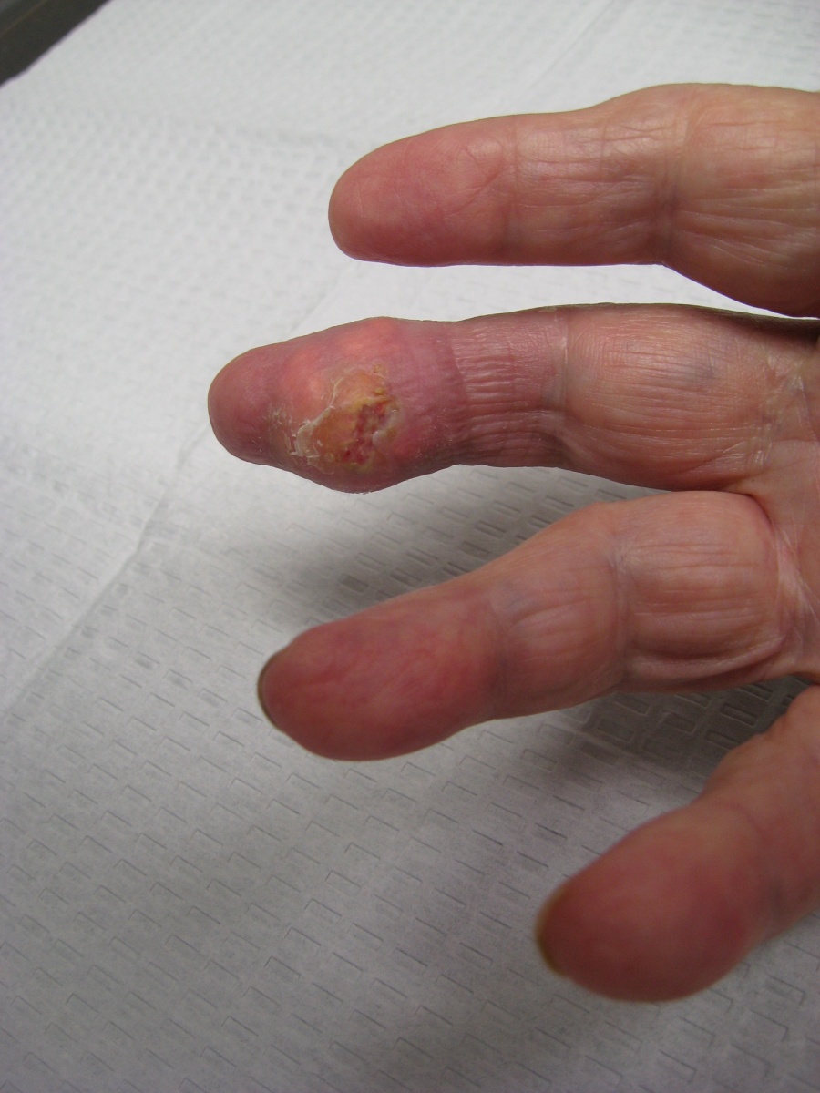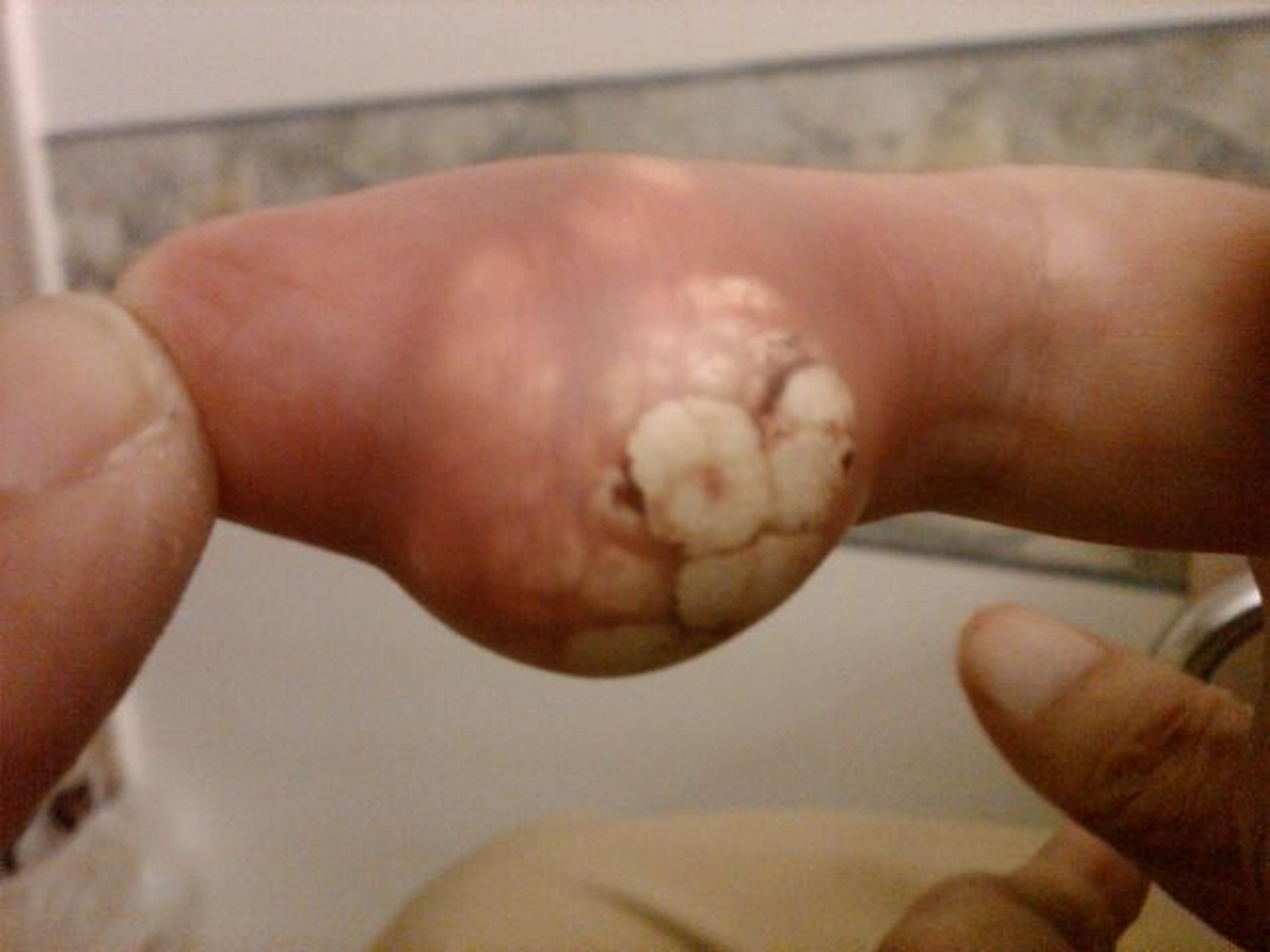gouty debris is visible in the open wound. The raised epithelium