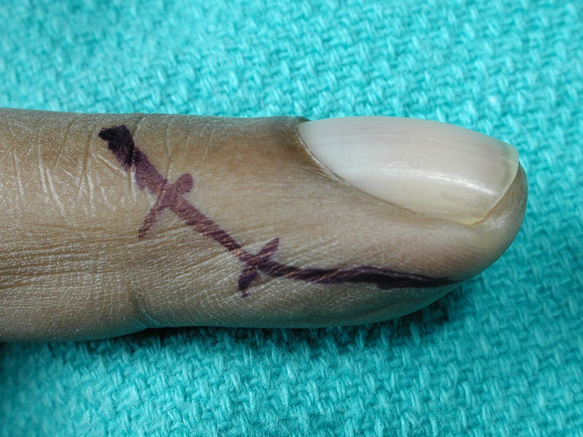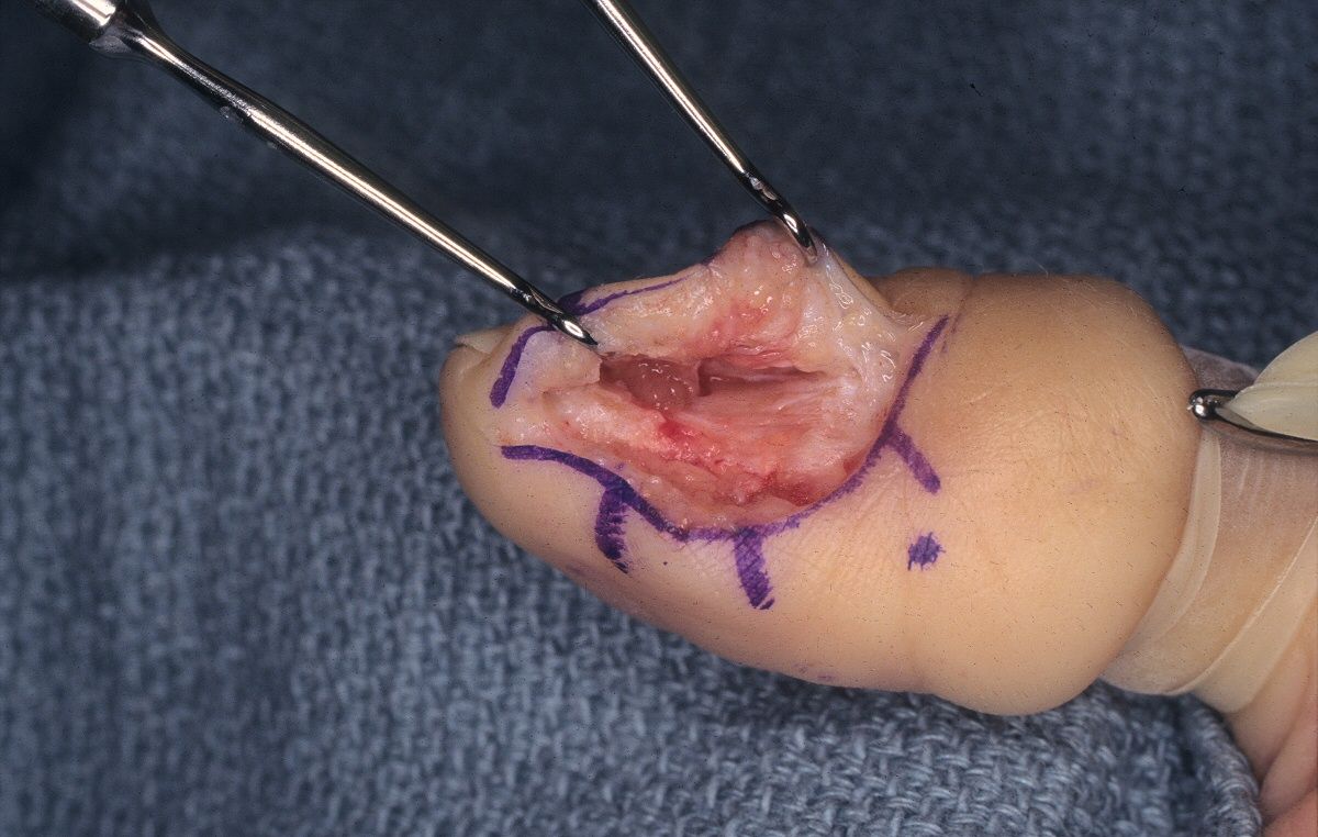 | Lateral incision. It is important to plan this incision to leave 3 or 4 millimeters of lateral eponychial skin to avoid breaching the lateral eponychial nail recess, which may result in a chronic skin sinus. |